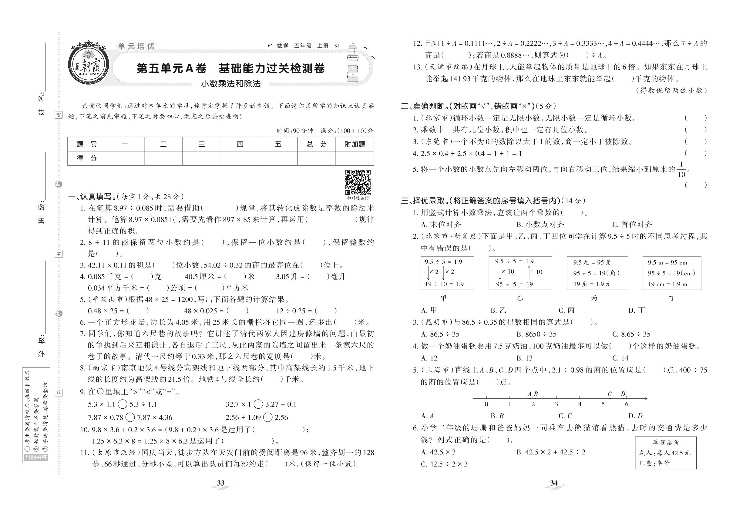 2021上册五年级数学苏教版 第五单元A卷 基础能力过关检测卷