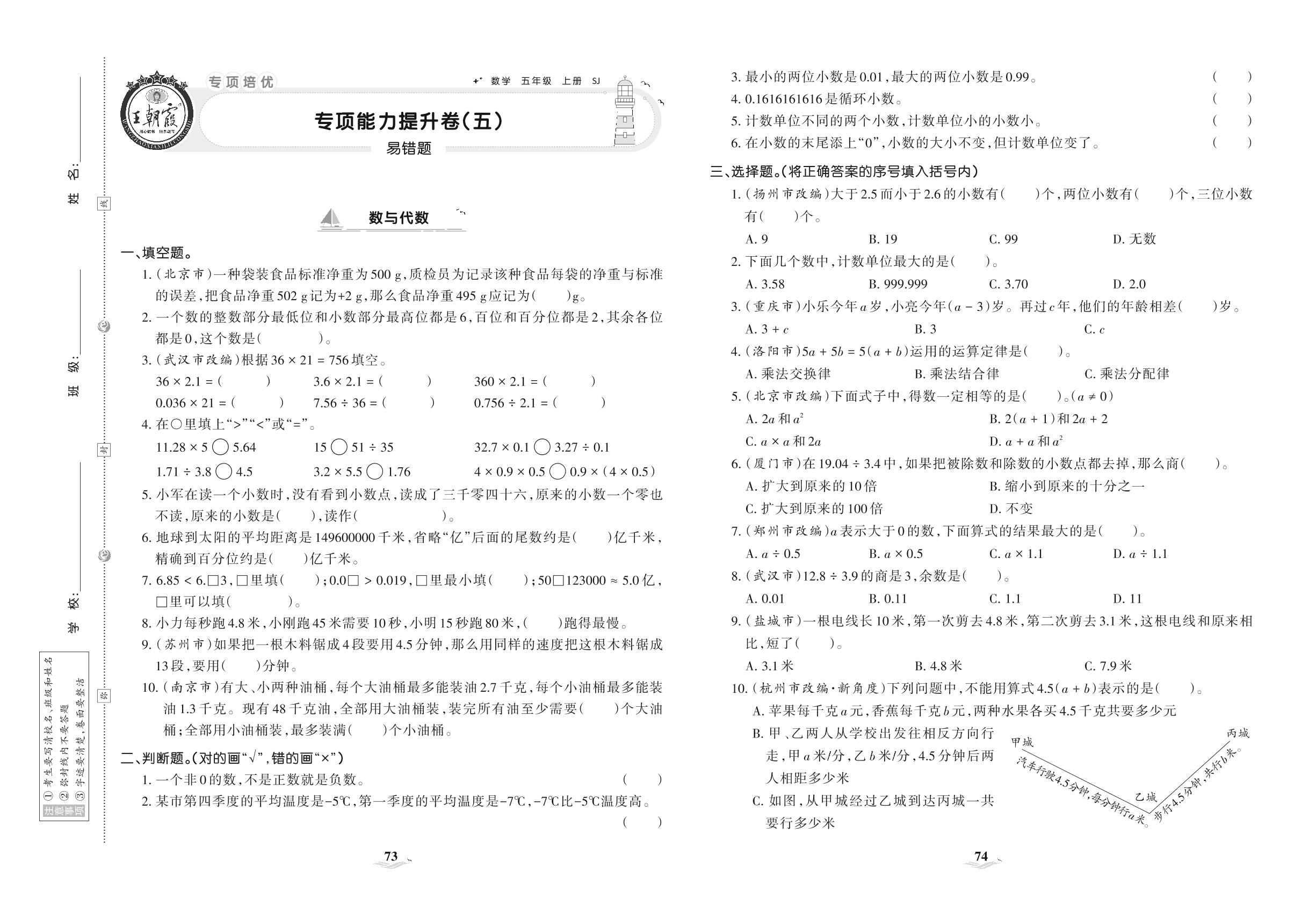 2021上册五年级数学苏教版 专项能力提升卷(五) 易错题