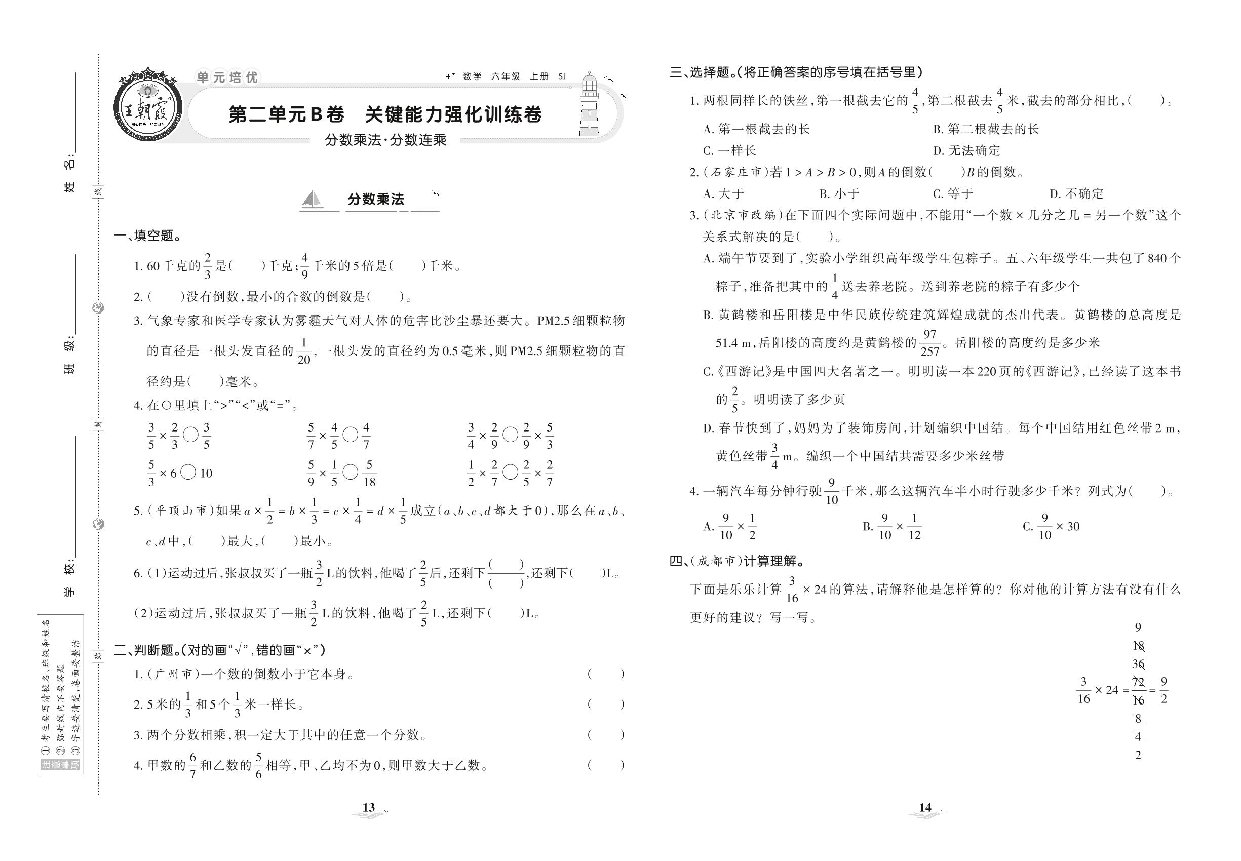 2021上册六年级数学苏教版 第二单元B卷 关键能力强化训练卷