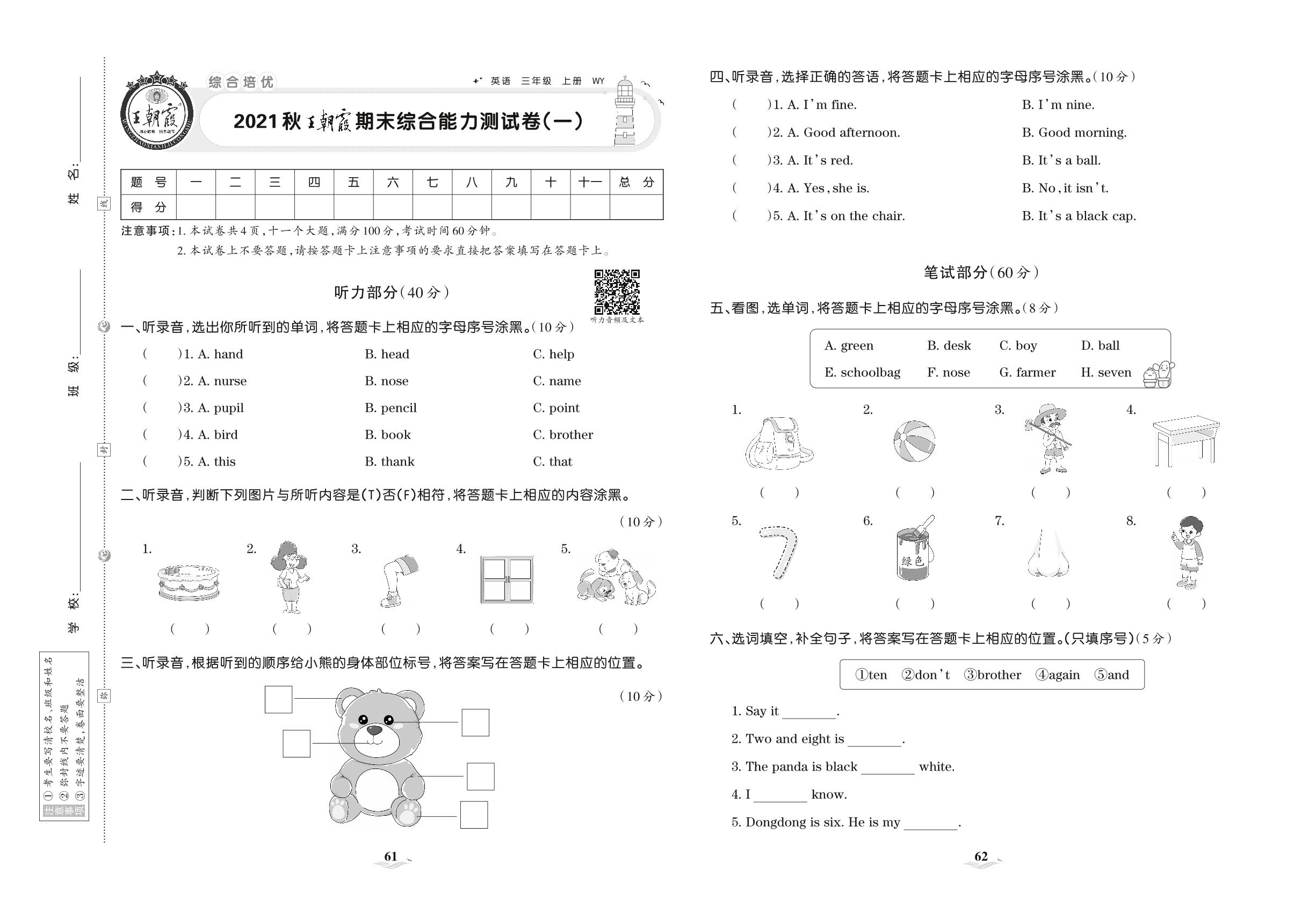 2021上册三年级英语外研版 王朝霞期末综合能力培优卷(一)