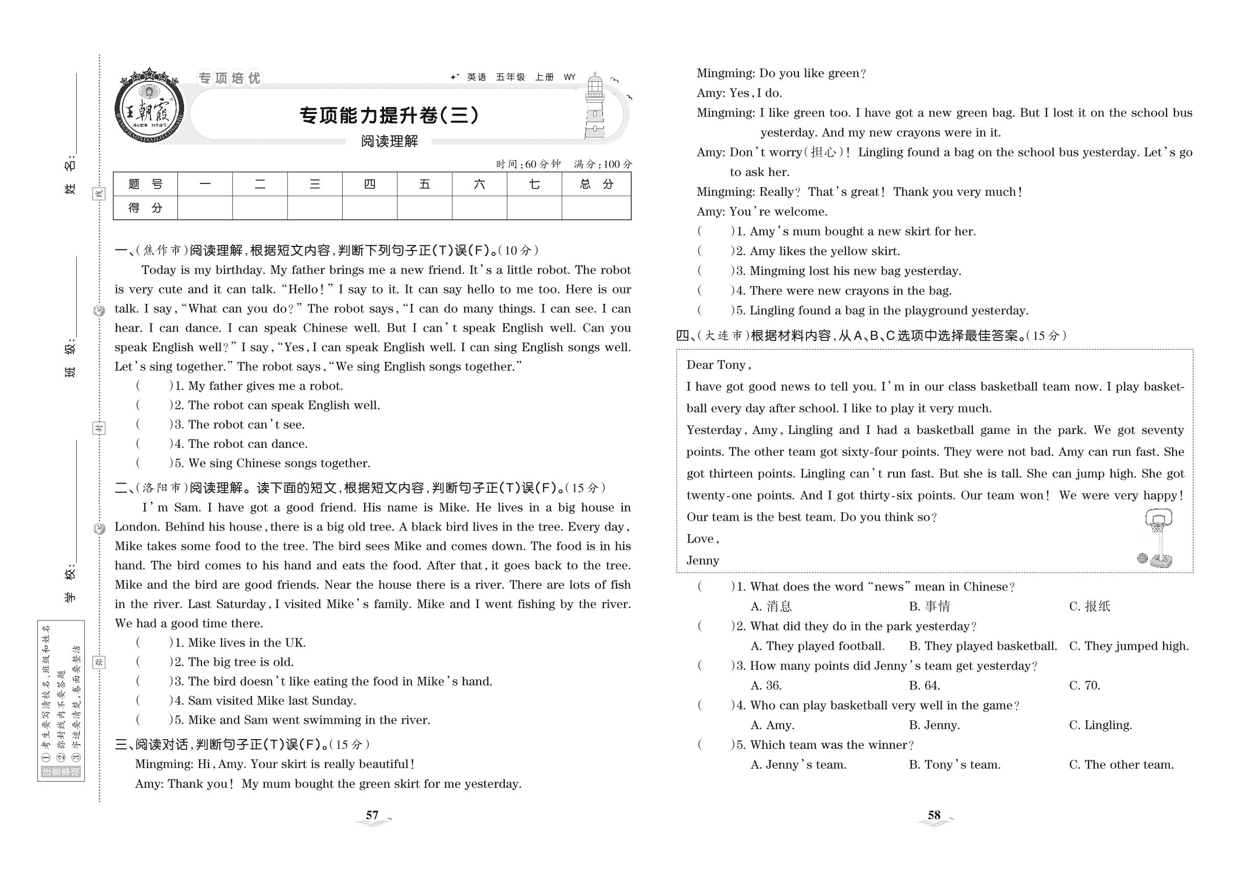 2021上册五年级英语外研版 专项能力提升卷(三) 阅读理解