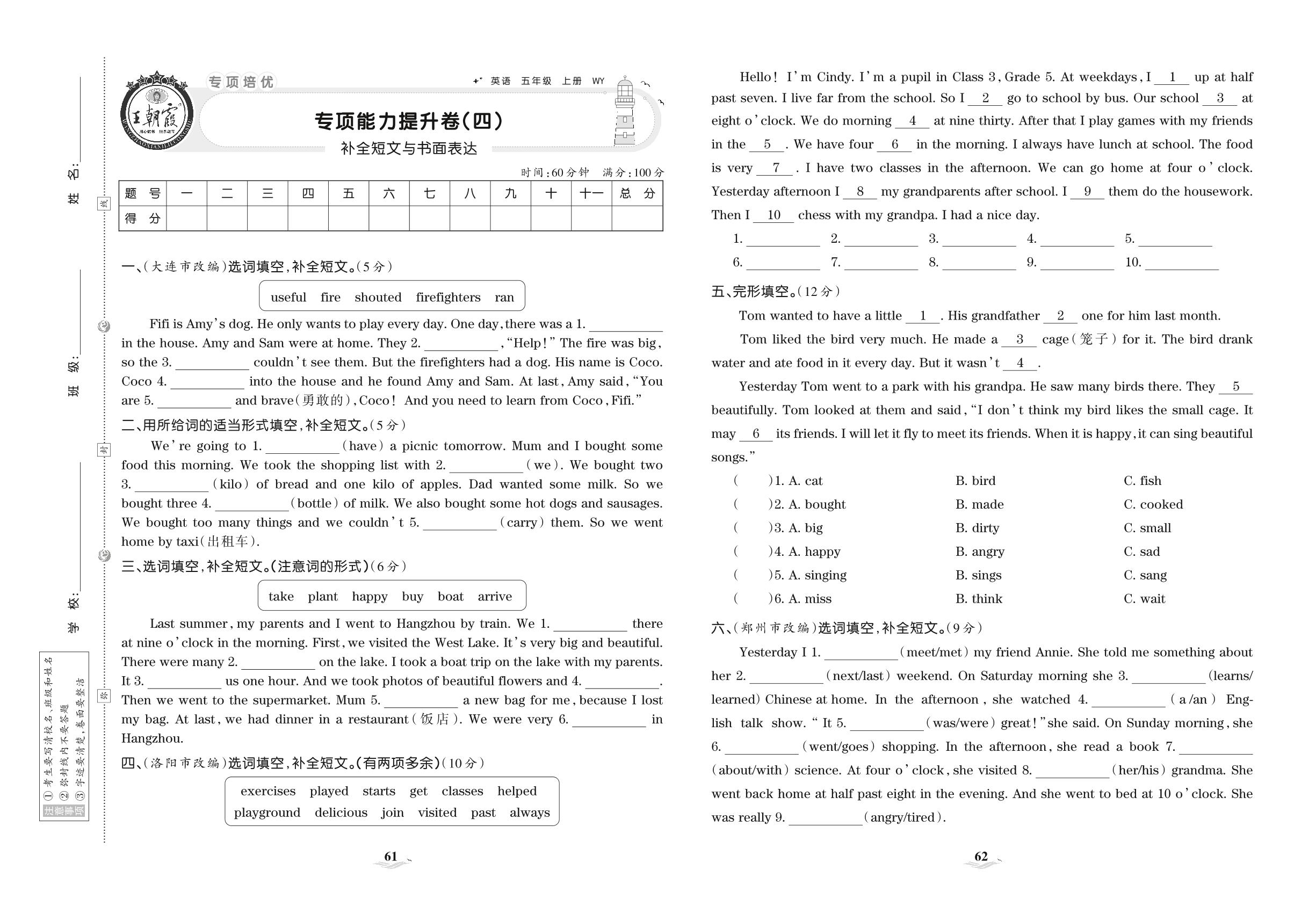 2021上册五年级英语外研版 专项能力提升卷(四) 补全短文与书面表达