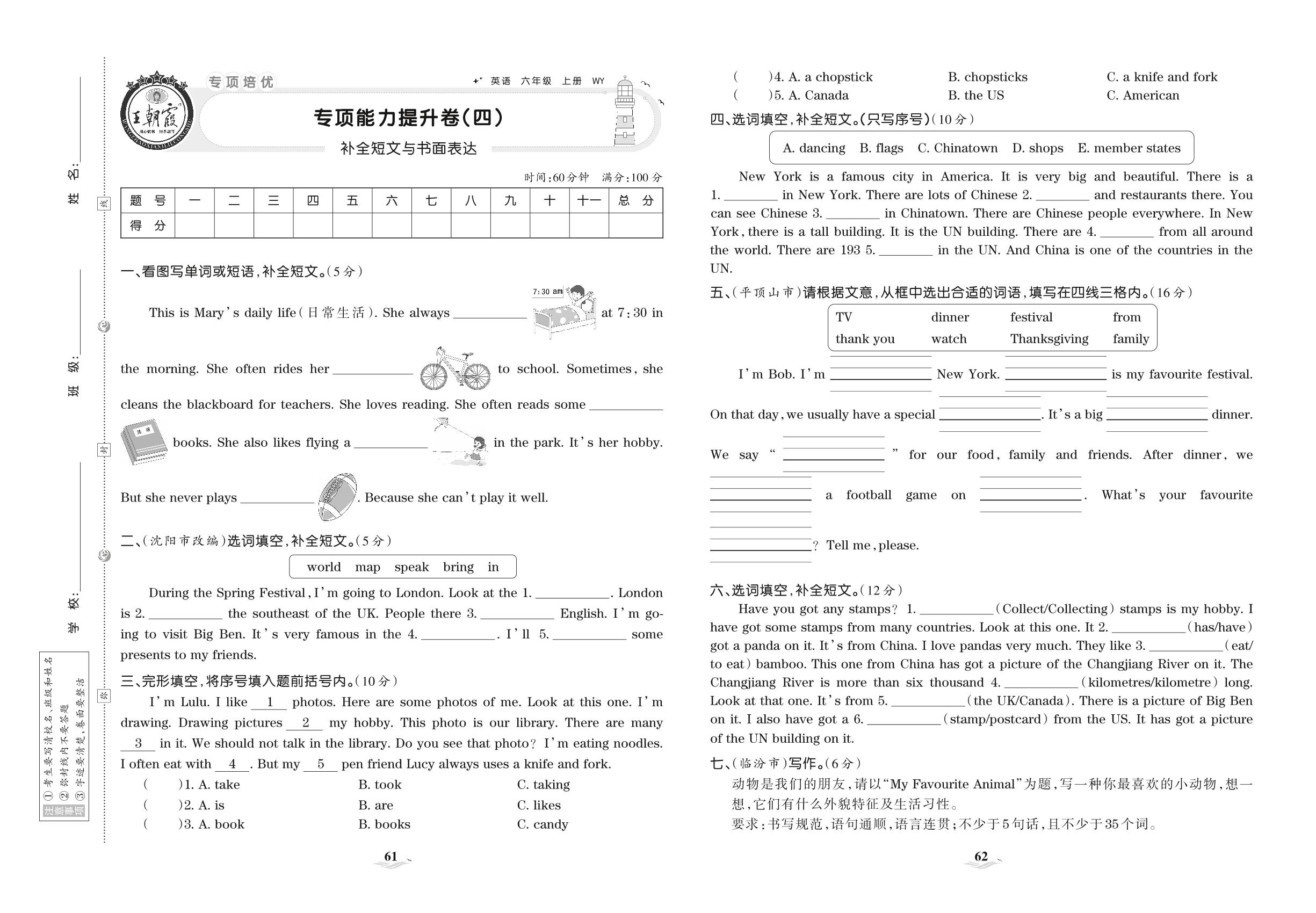 2021上册六年级英语外研版 专项能力提升卷(四) 补全短文与书面表达