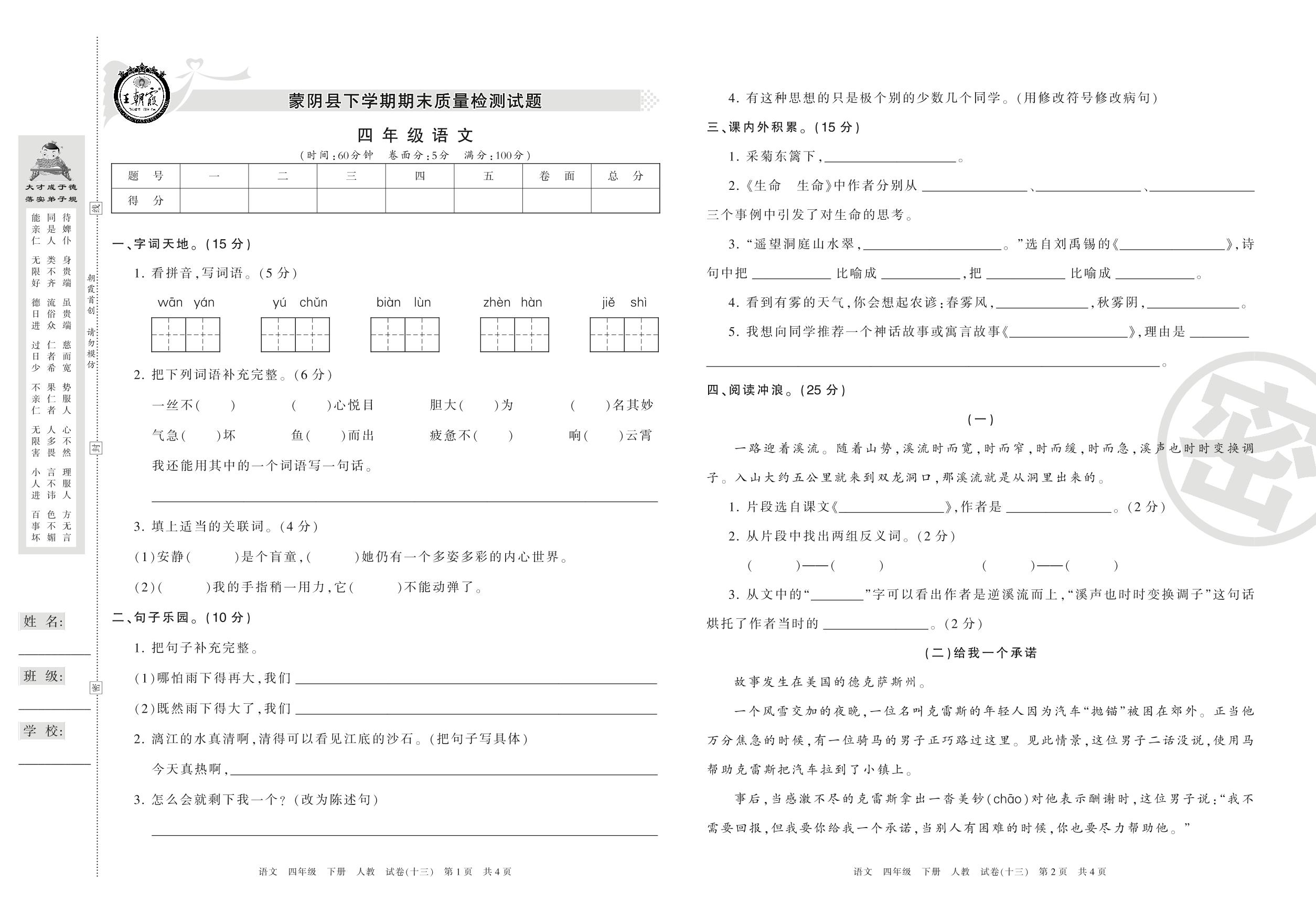 2015-2016学年第二学期临沂市蒙阴县四年级语文试卷(人教版)【13】