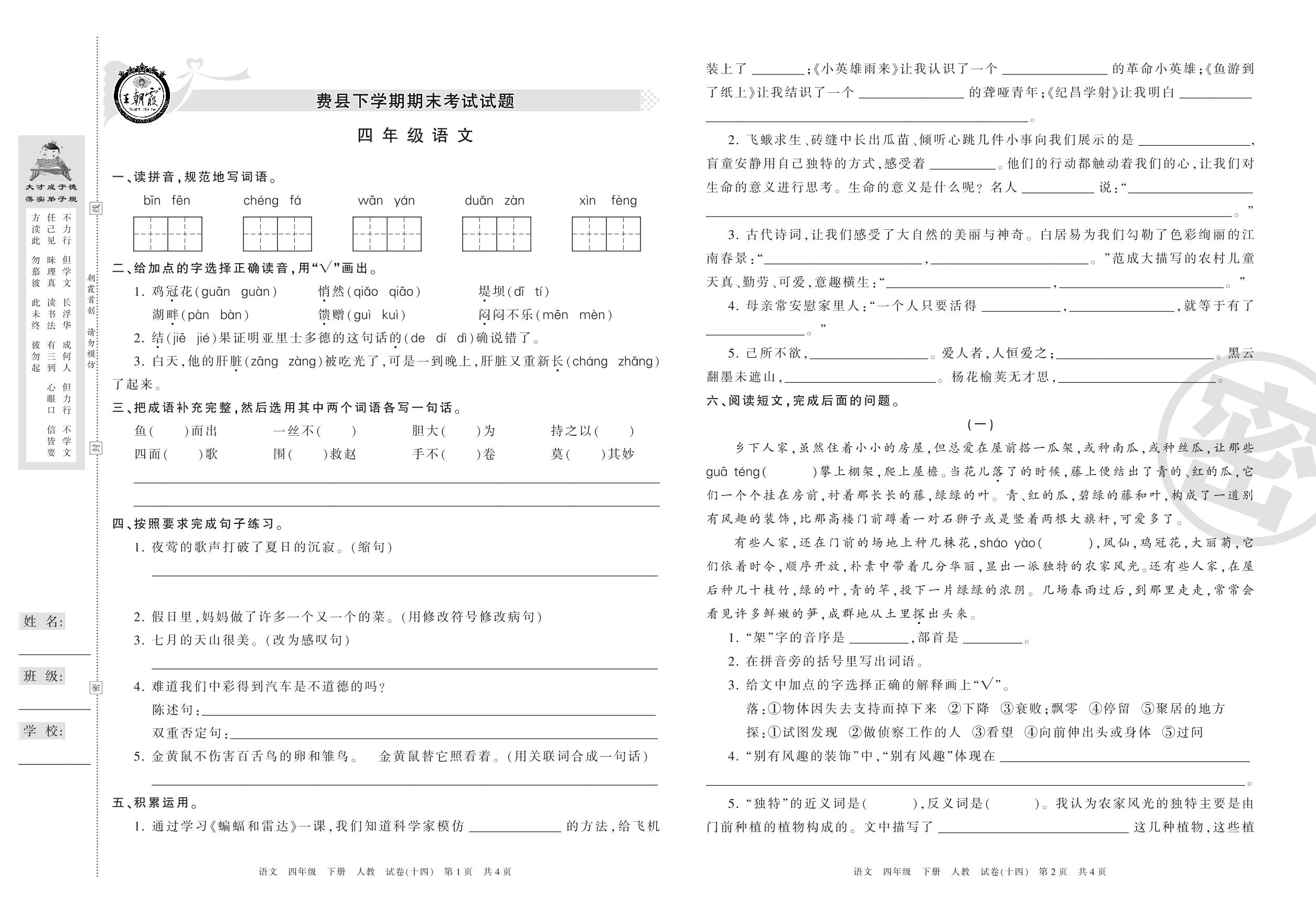 2015-2016学年第二学期临沂市费县四年级语文试卷(人教版)【14】