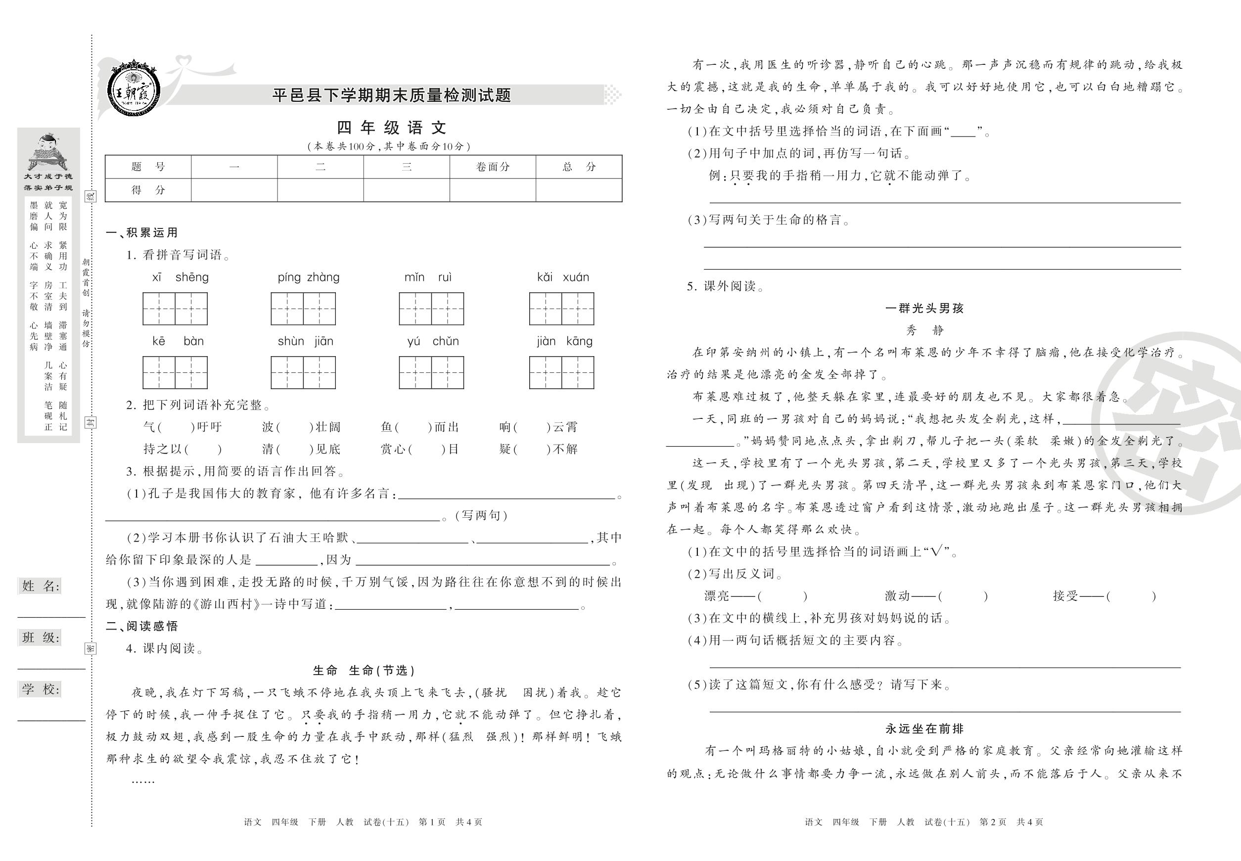 2015-2016学年第二学期临沂市平邑县四年级语文试卷(人教版)【15】