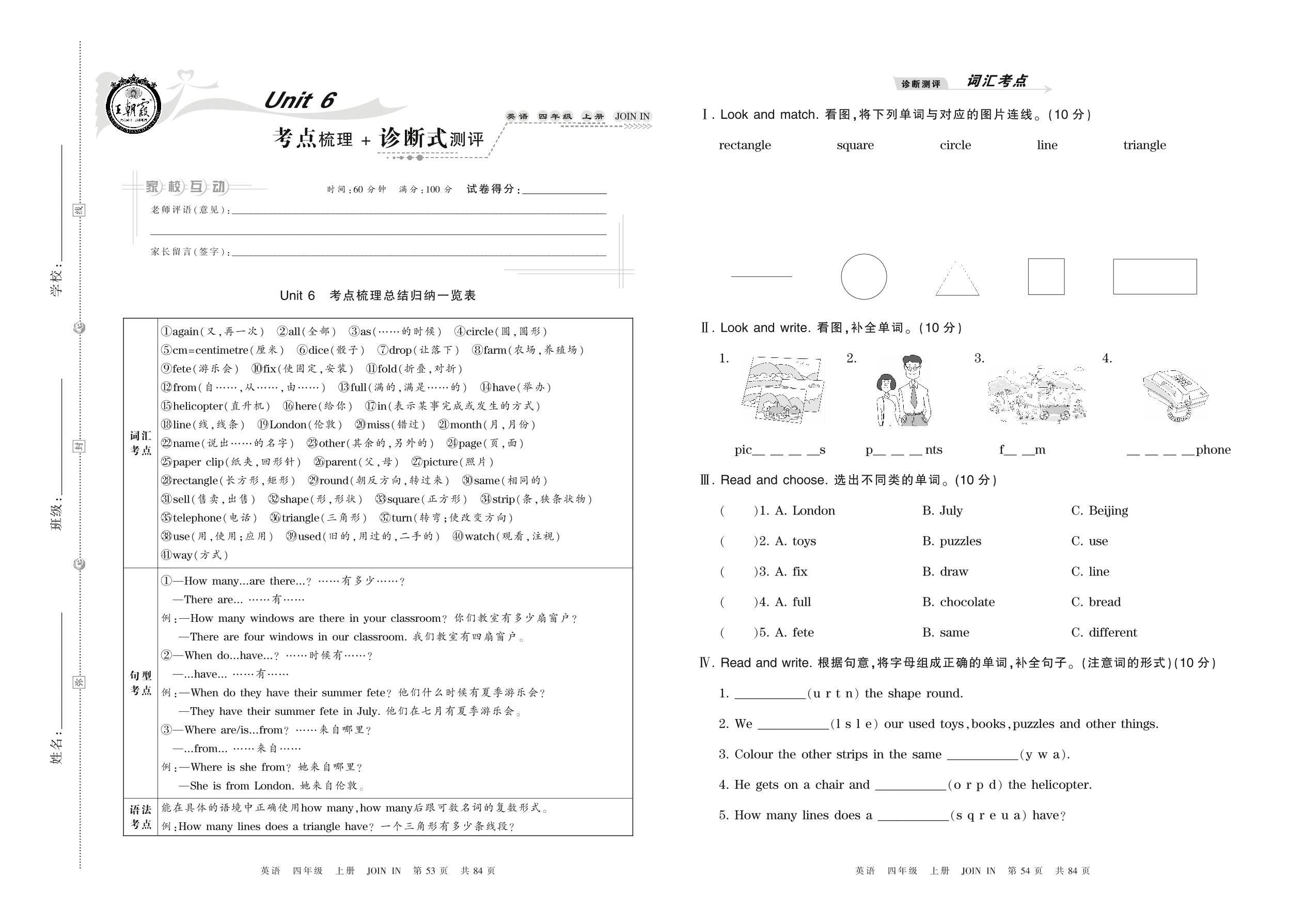 2021上册四年级英语剑桥版 Unit 6 考点梳理 + 诊断式测评