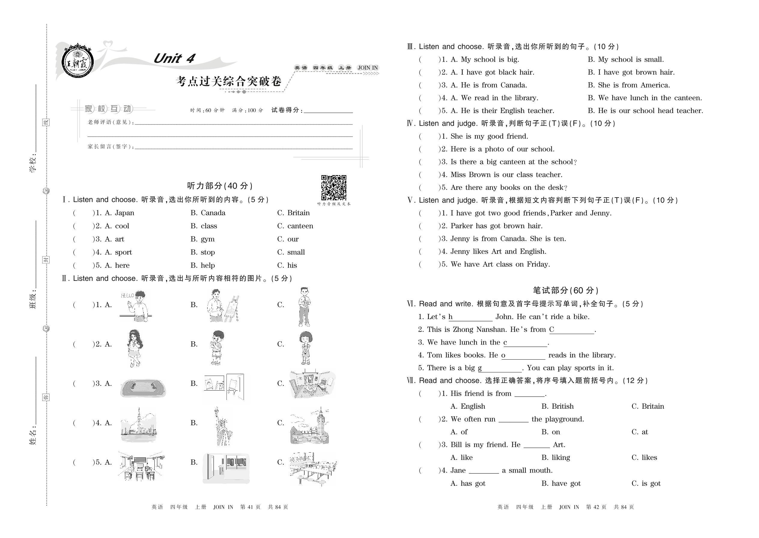 四年级英语剑桥版上册单元卷