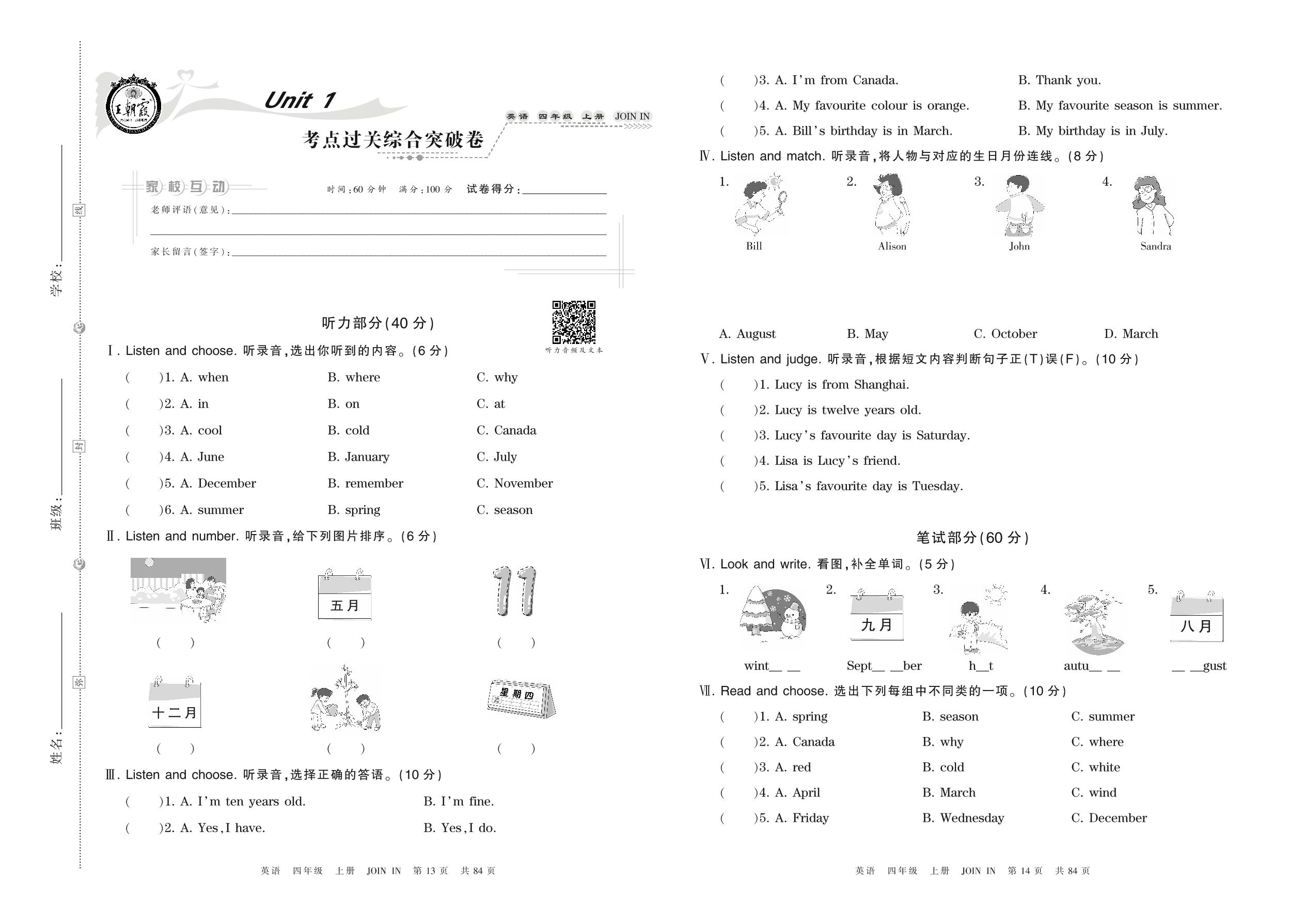 2021上册四年级英语剑桥版 Unit 1 考点过关综合突破卷