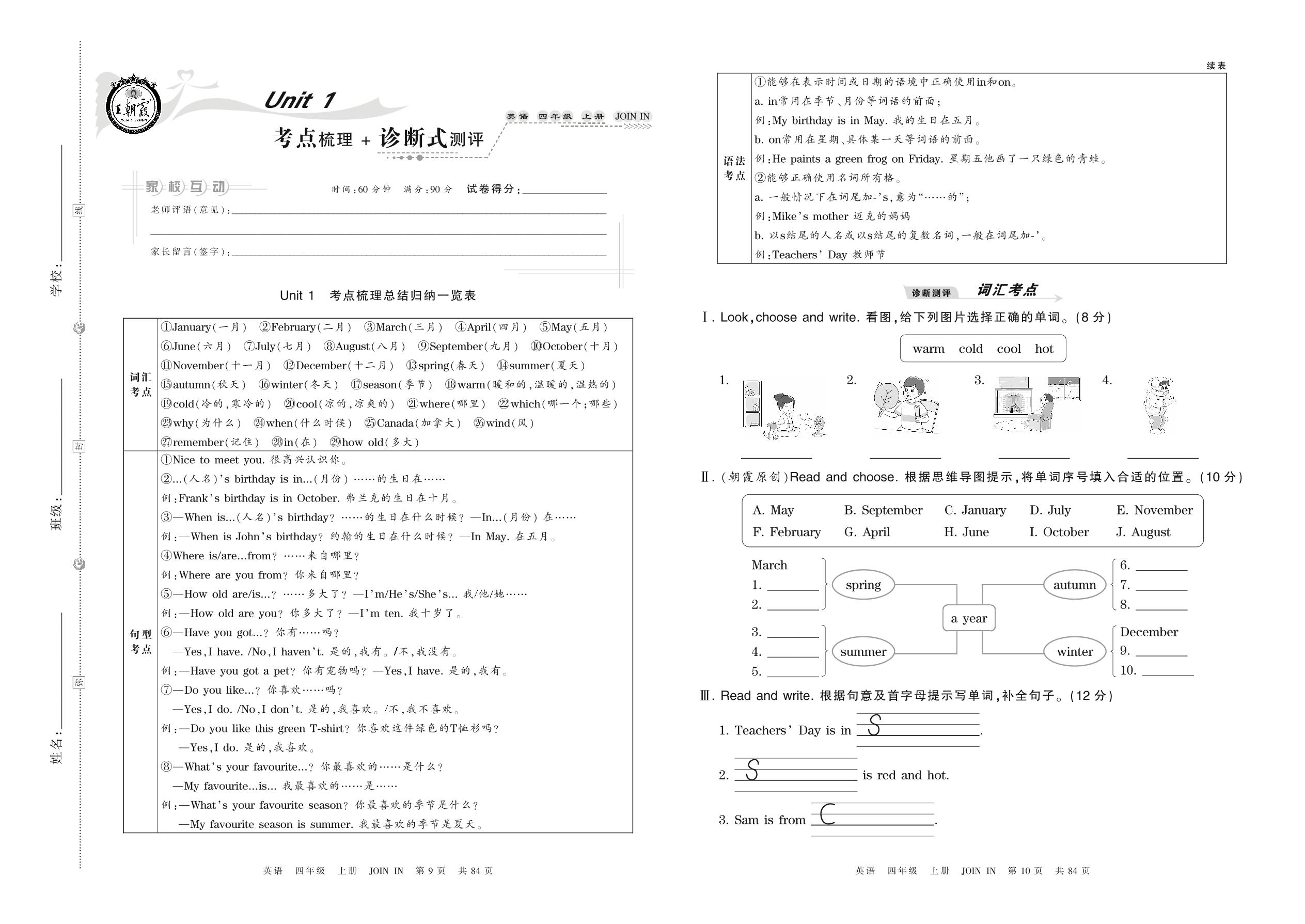2021上册四年级英语剑桥版 Unit 1 考点梳理 + 诊断式测评