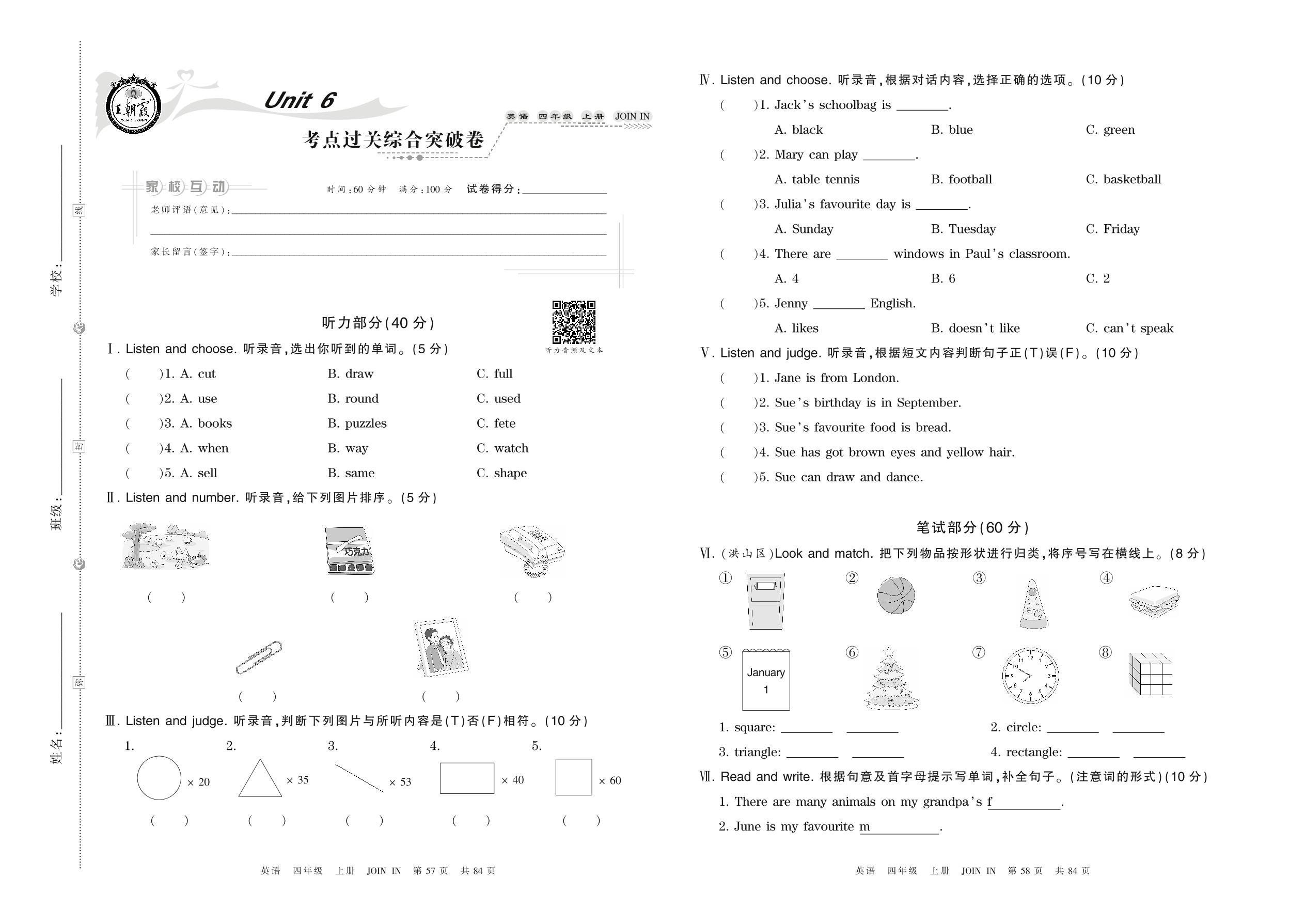 2021上册四年级英语剑桥版 Unit 6 考点过关综合突破卷