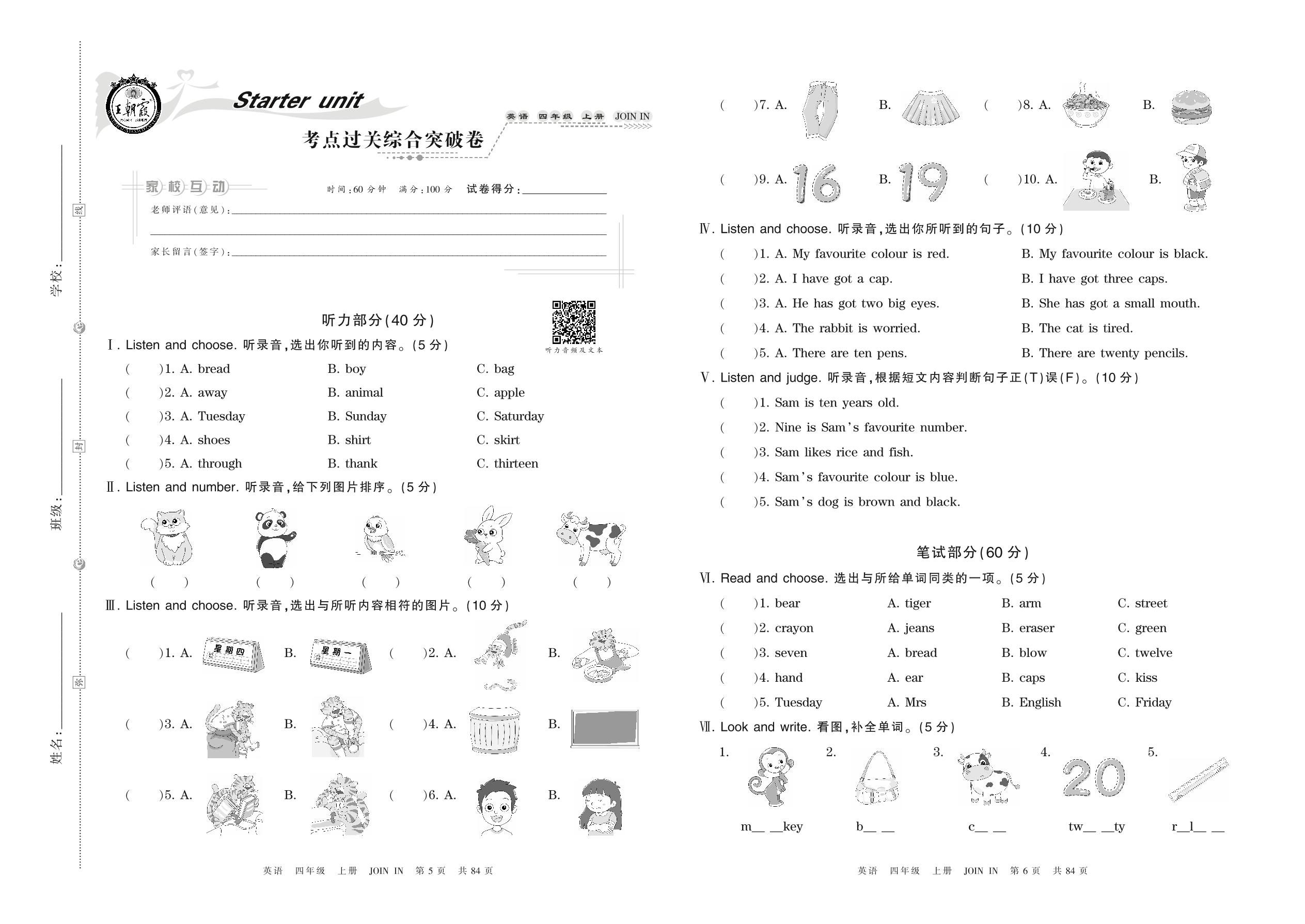 2021上册四年级英语剑桥版 Starter unit 考点过关综合突破卷