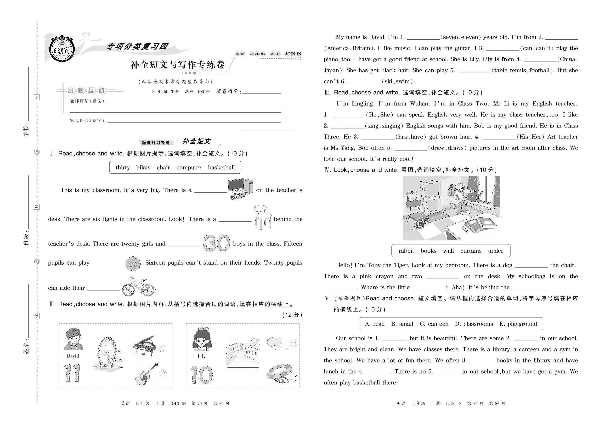 2021上册四年级英语剑桥版 补全短文与写作专练卷