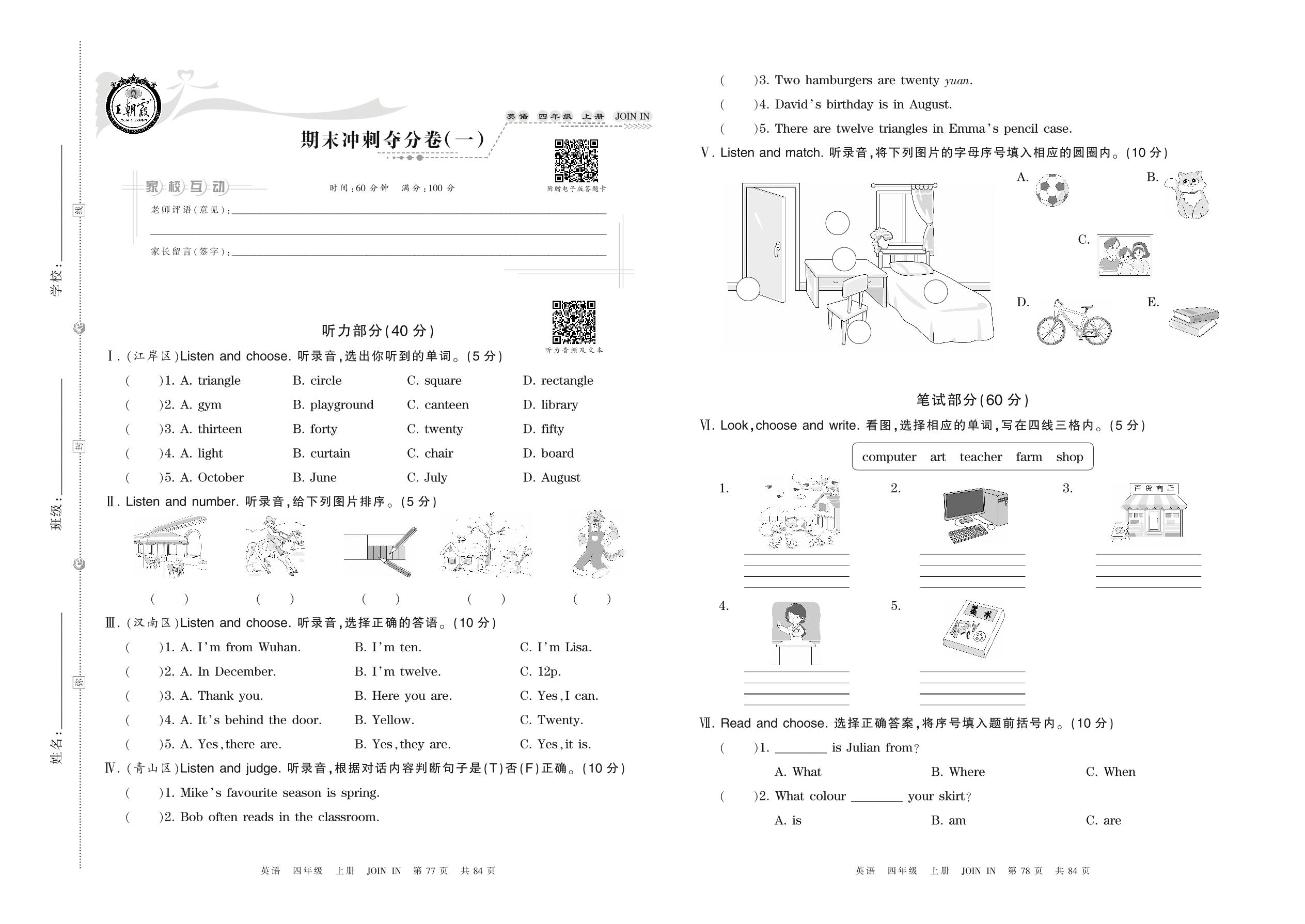 2021上册四年级英语剑桥版 期末冲刺夺分卷(一)