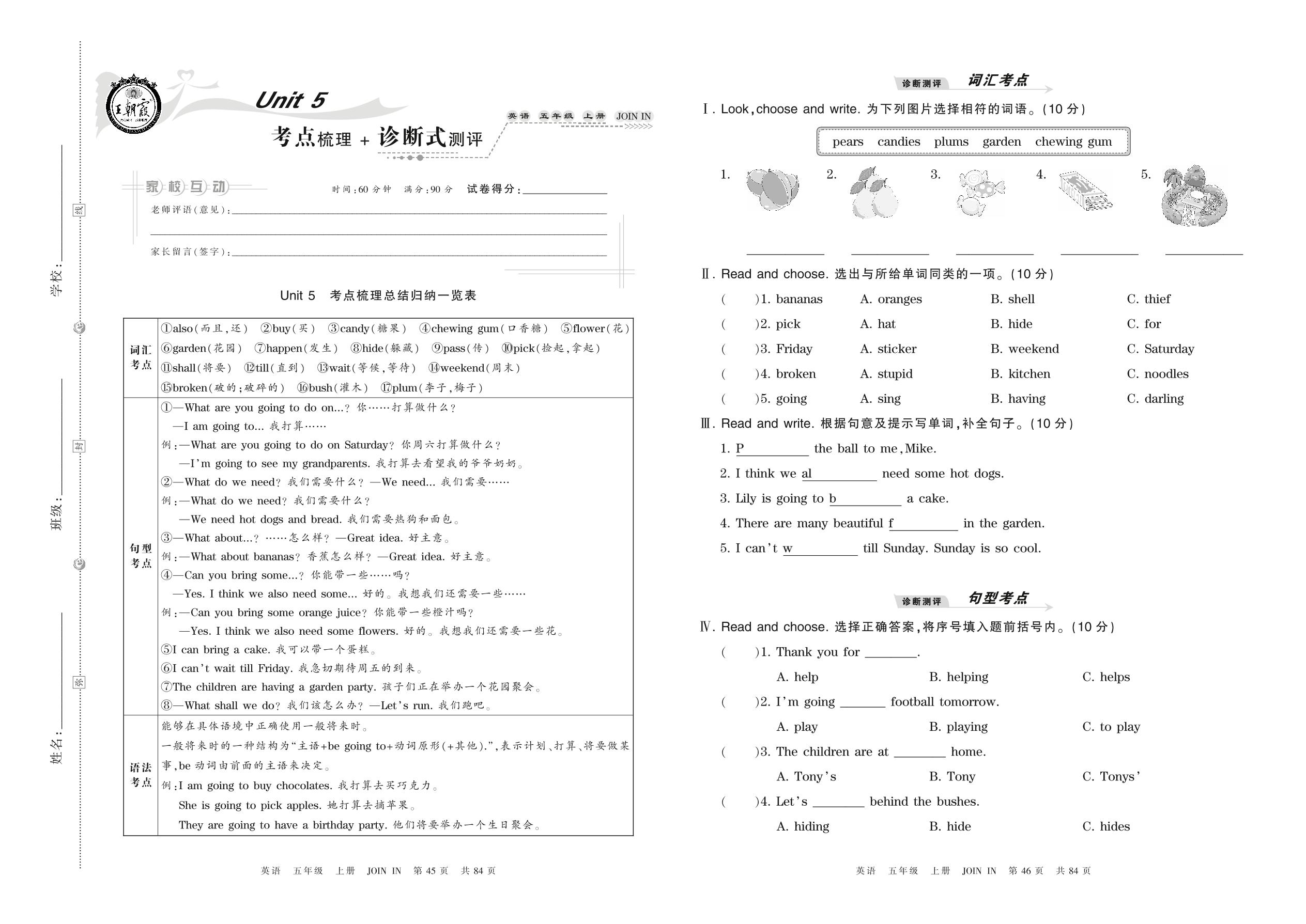 2021上册五年级英语剑桥版 Unit 5 考点梳理 + 诊断式测评