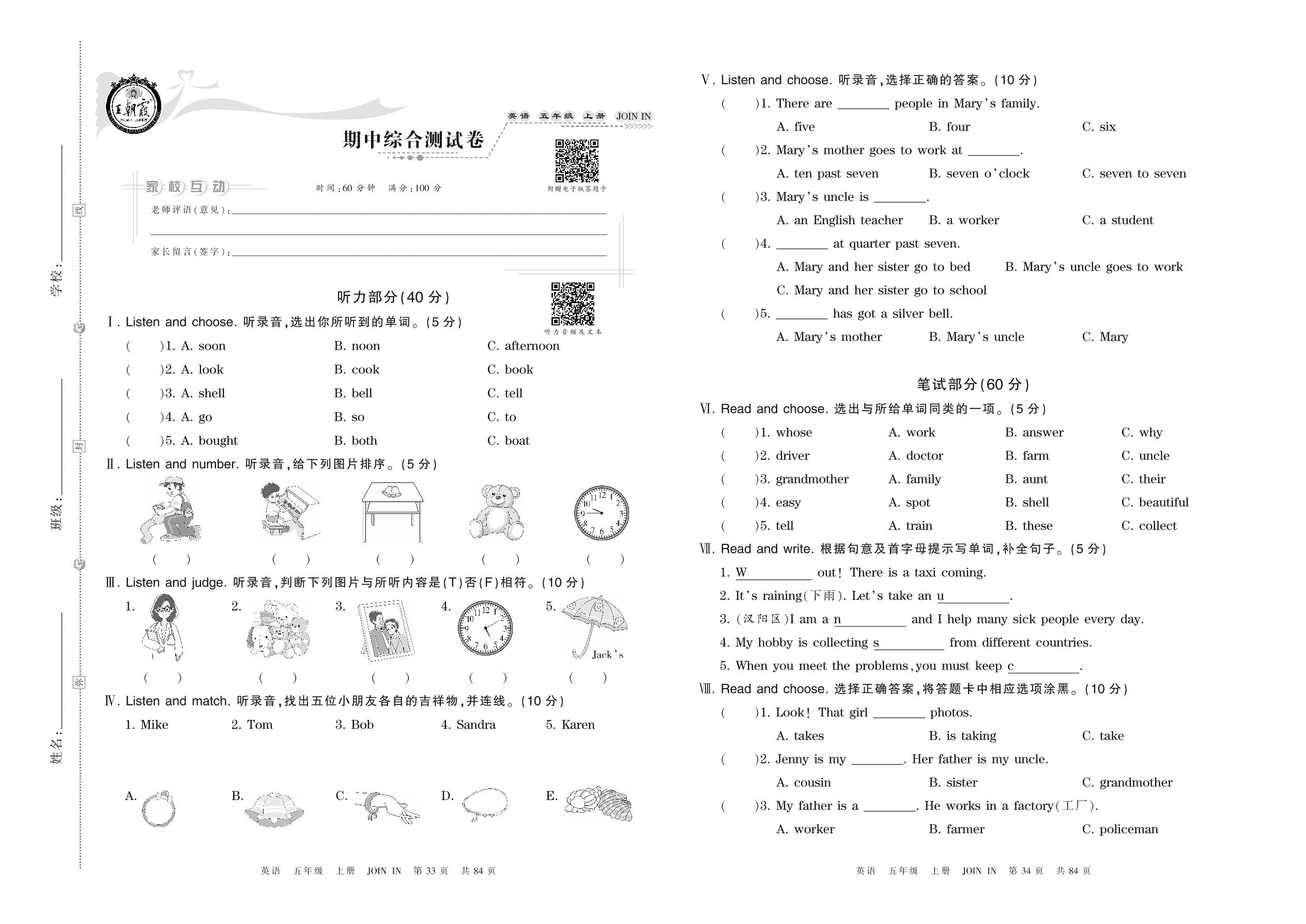 五年级英语剑桥版上册期中卷