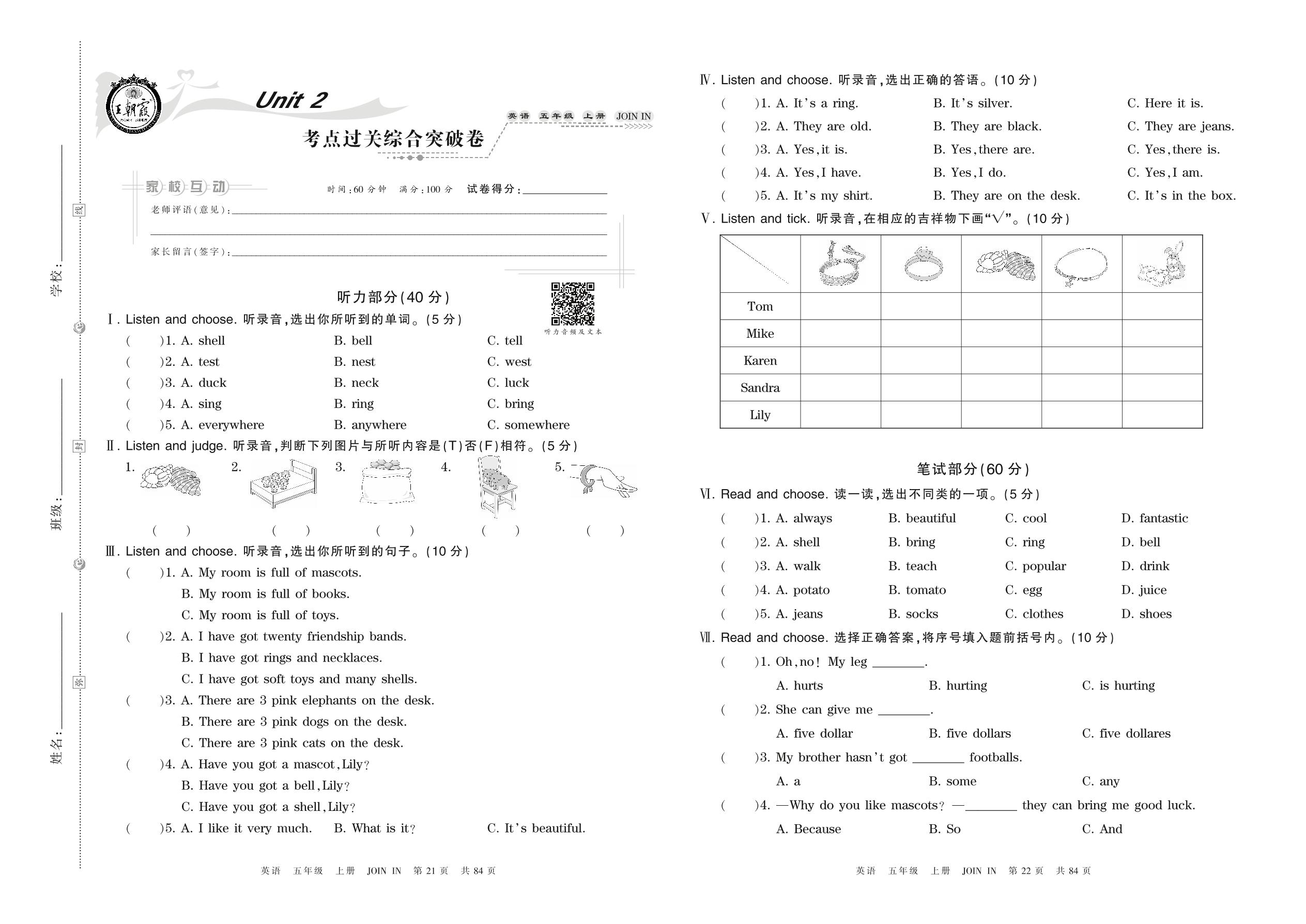 2021上册五年级英语剑桥版 Unit 2 考点过关综合突破卷