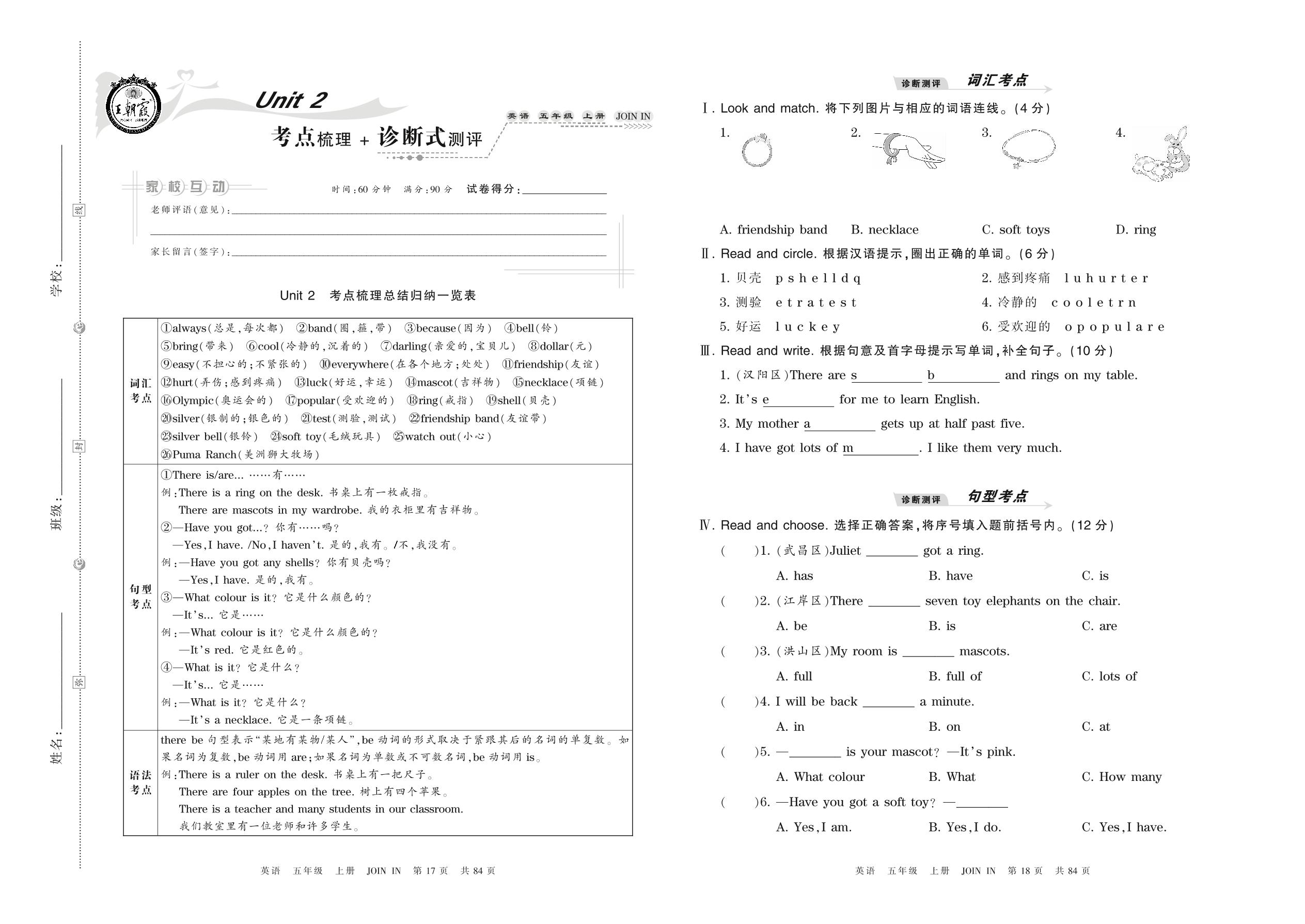 2021上册五年级英语剑桥版 Unit 2 考点梳理 + 诊断式测评