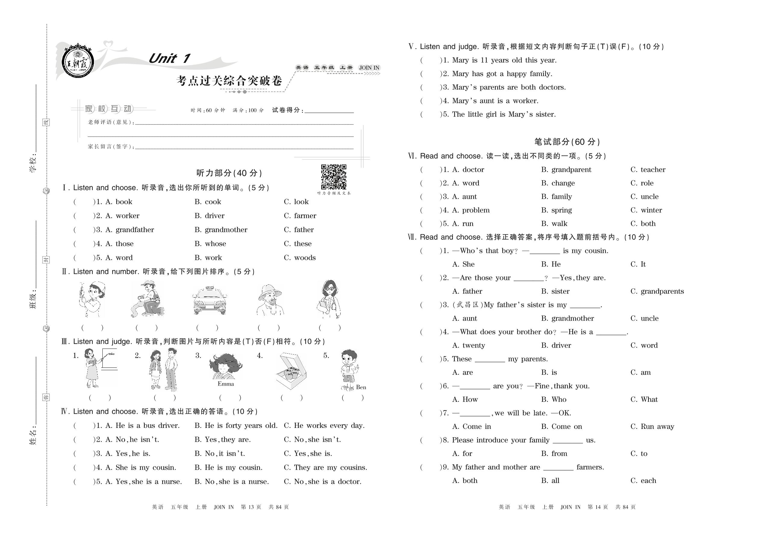 2021上册五年级英语剑桥版 Unit 1 考点过关综合突破卷