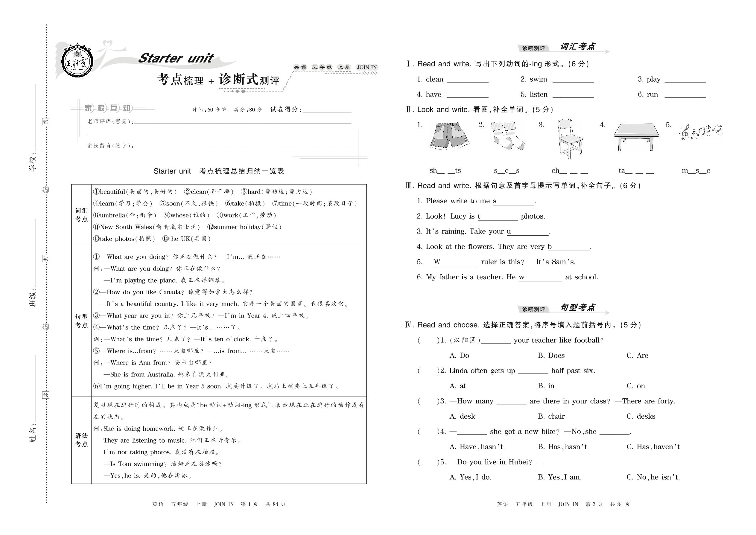 2021上册五年级英语剑桥版 Starter unit 考点梳理 + 诊断式测评