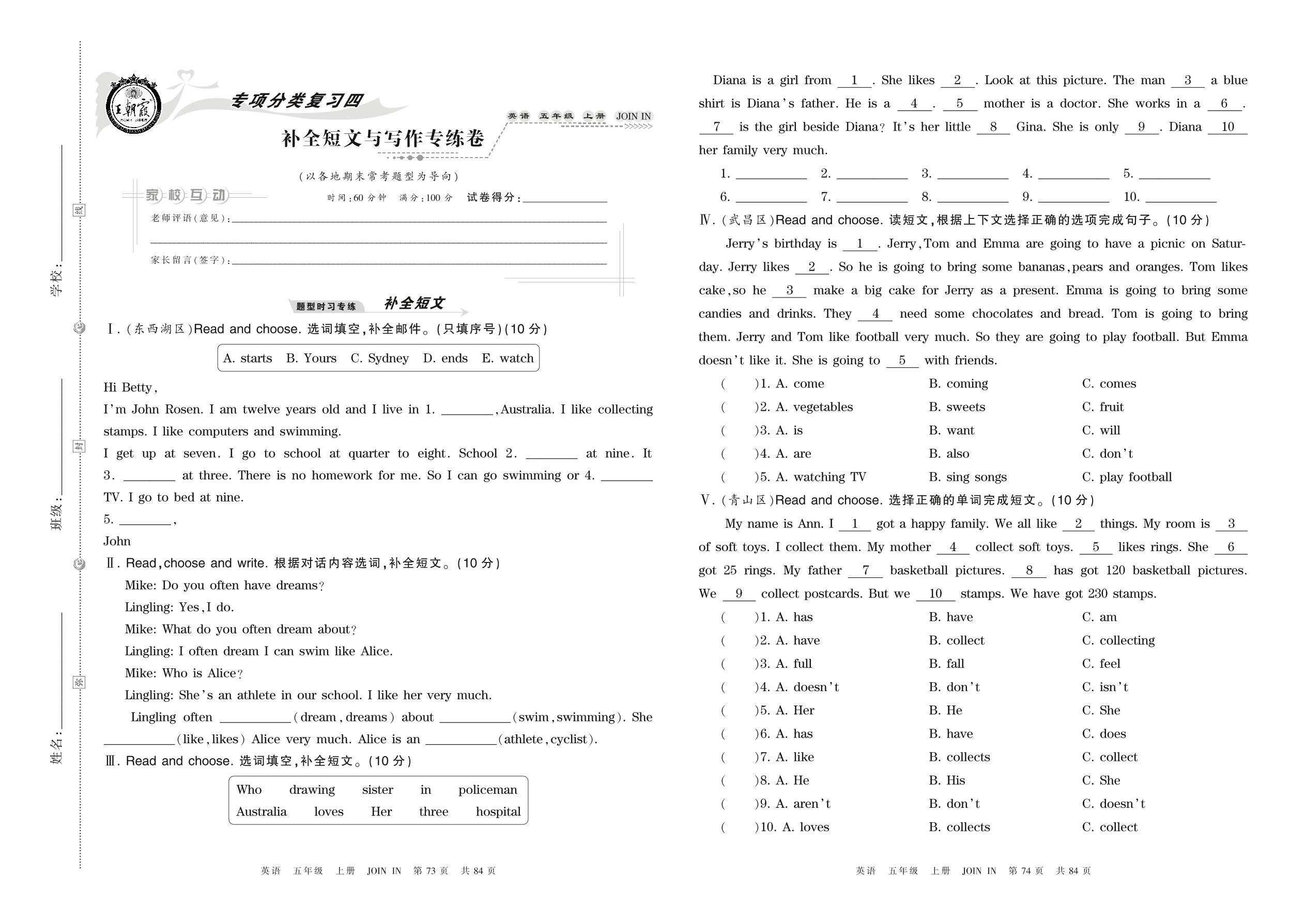 2021上册五年级英语剑桥版 补全短文与写作专练卷