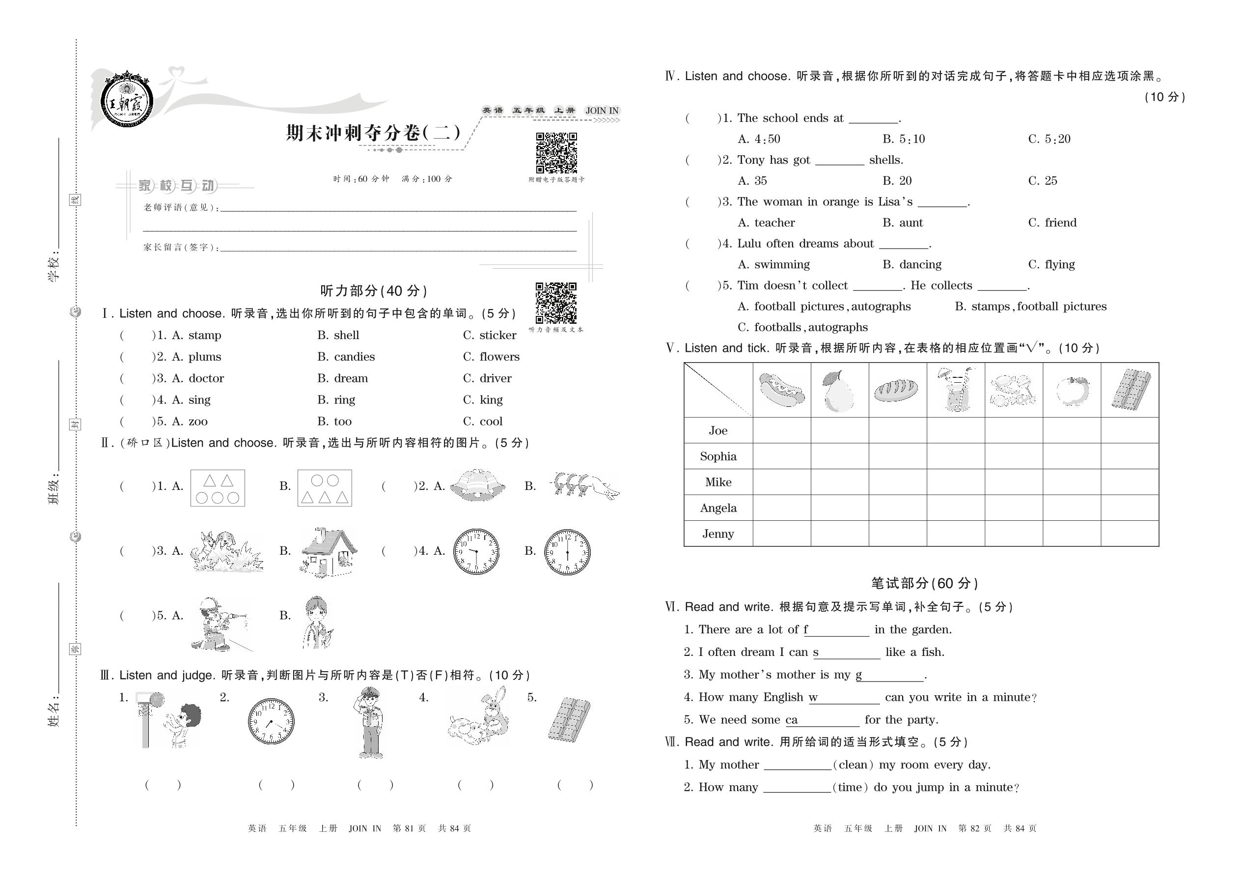 2021上册五年级英语剑桥版 期末冲刺夺分卷(二)
