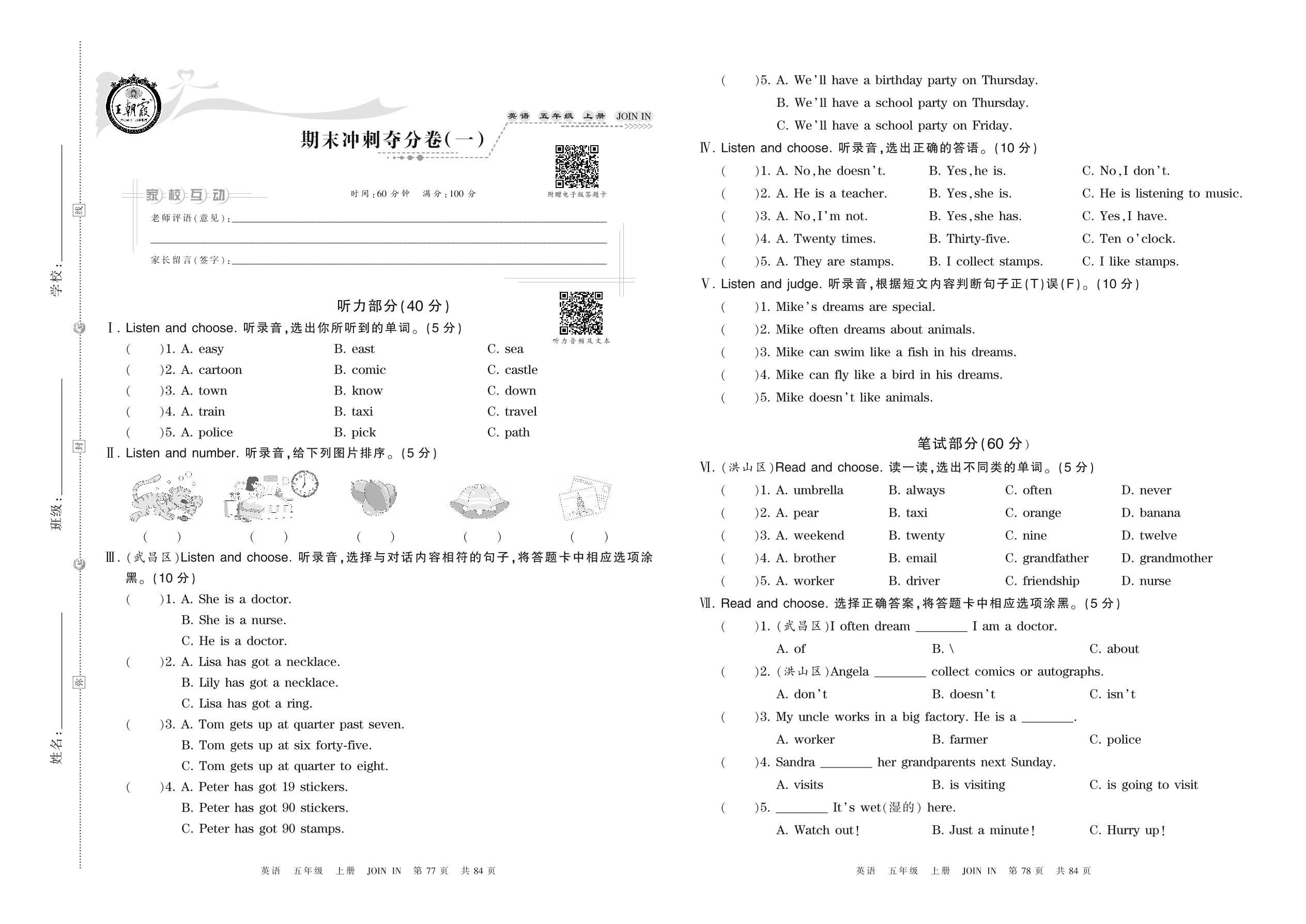 2021上册五年级英语剑桥版 期末冲刺夺分卷(一)