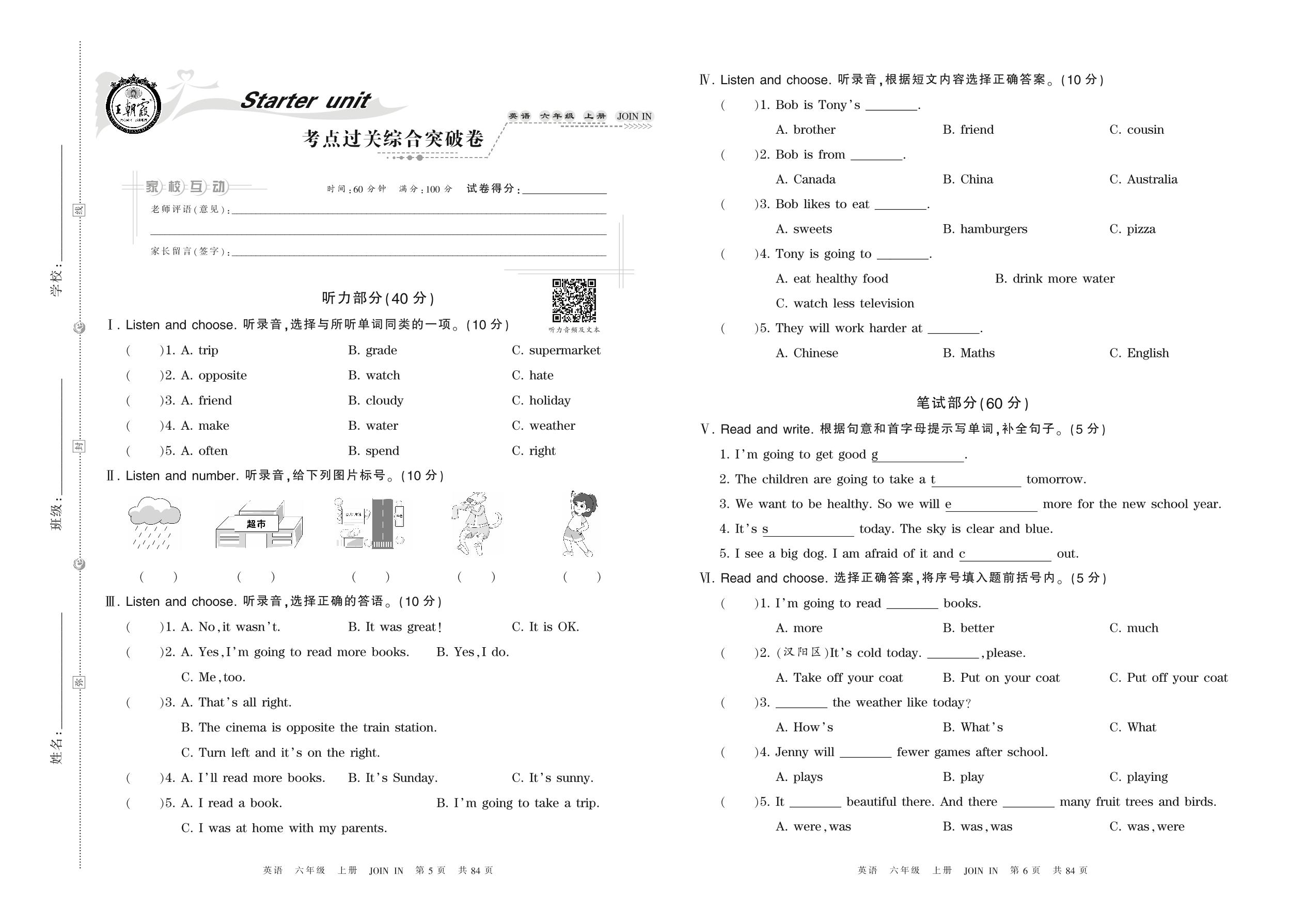 2021上册六年级英语剑桥版 Starter unit 考点过关综合突破卷