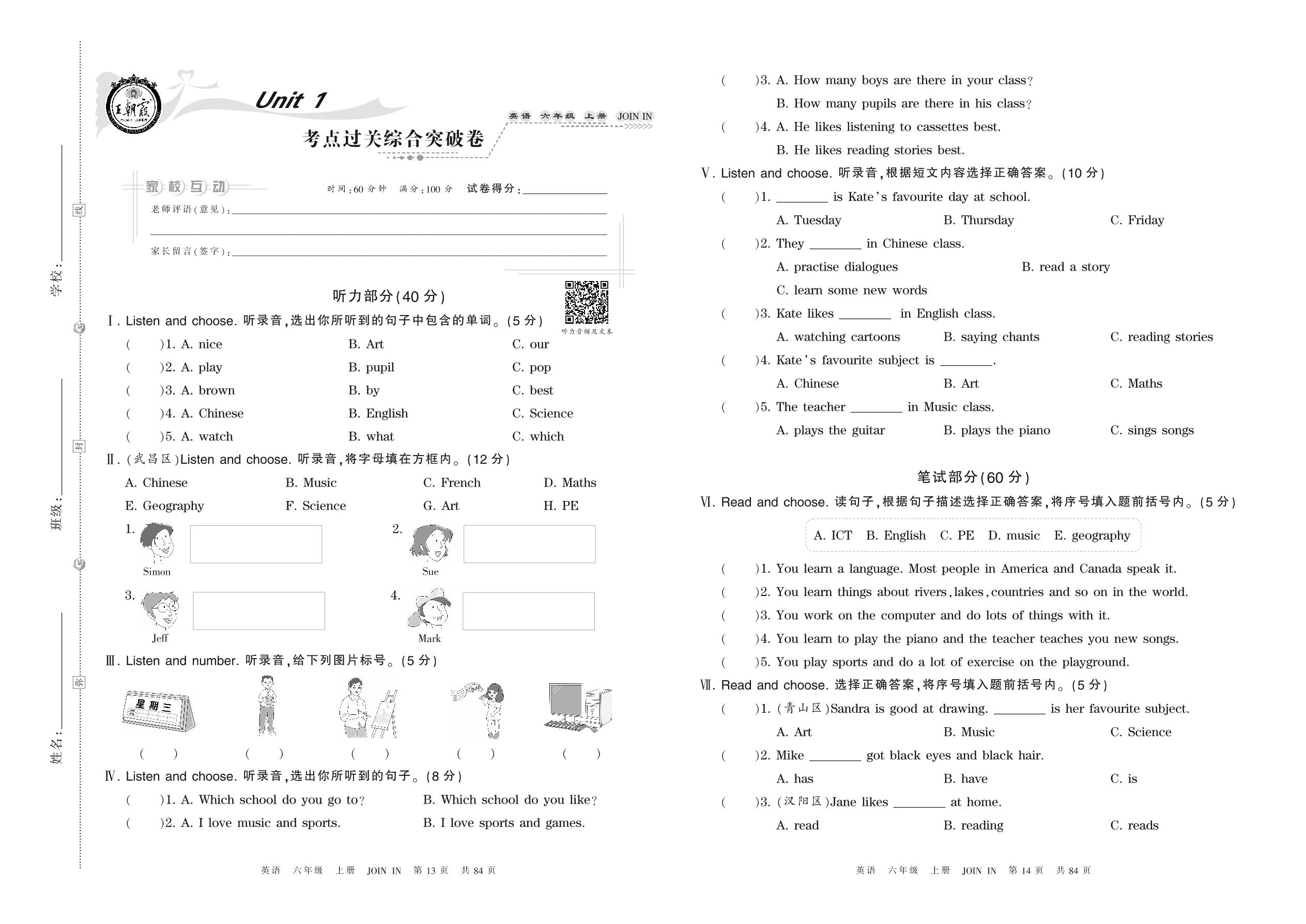 六年级英语剑桥版上册单元卷