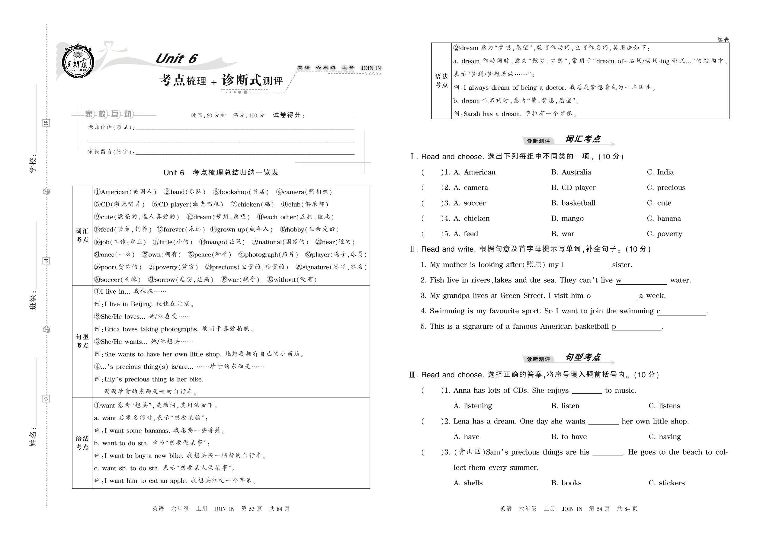 2021上册六年级英语剑桥版 Unit 6 考点梳理 + 诊断式测评