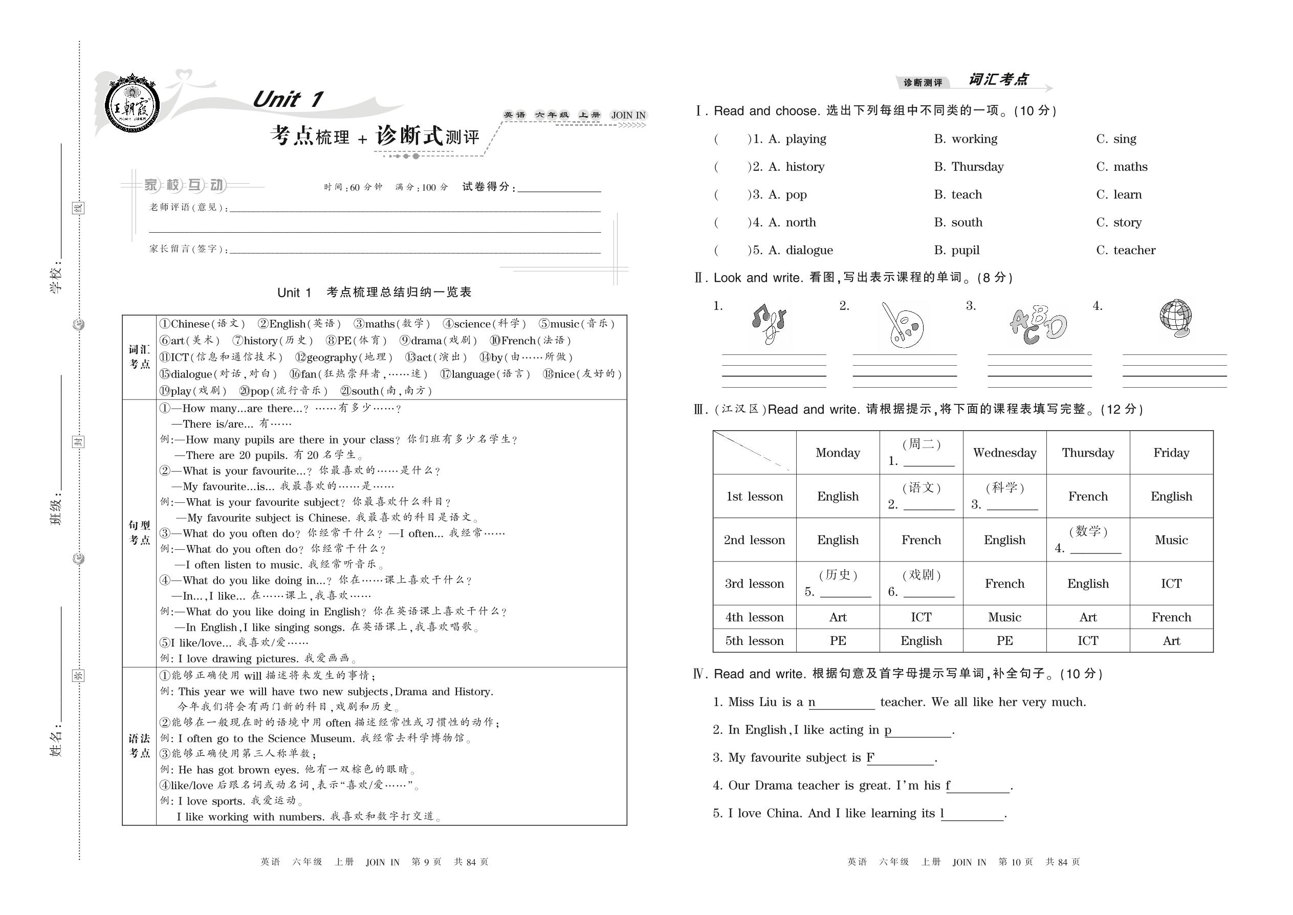 2021上册六年级英语剑桥版 Unit 1 考点梳理 + 诊断式测评