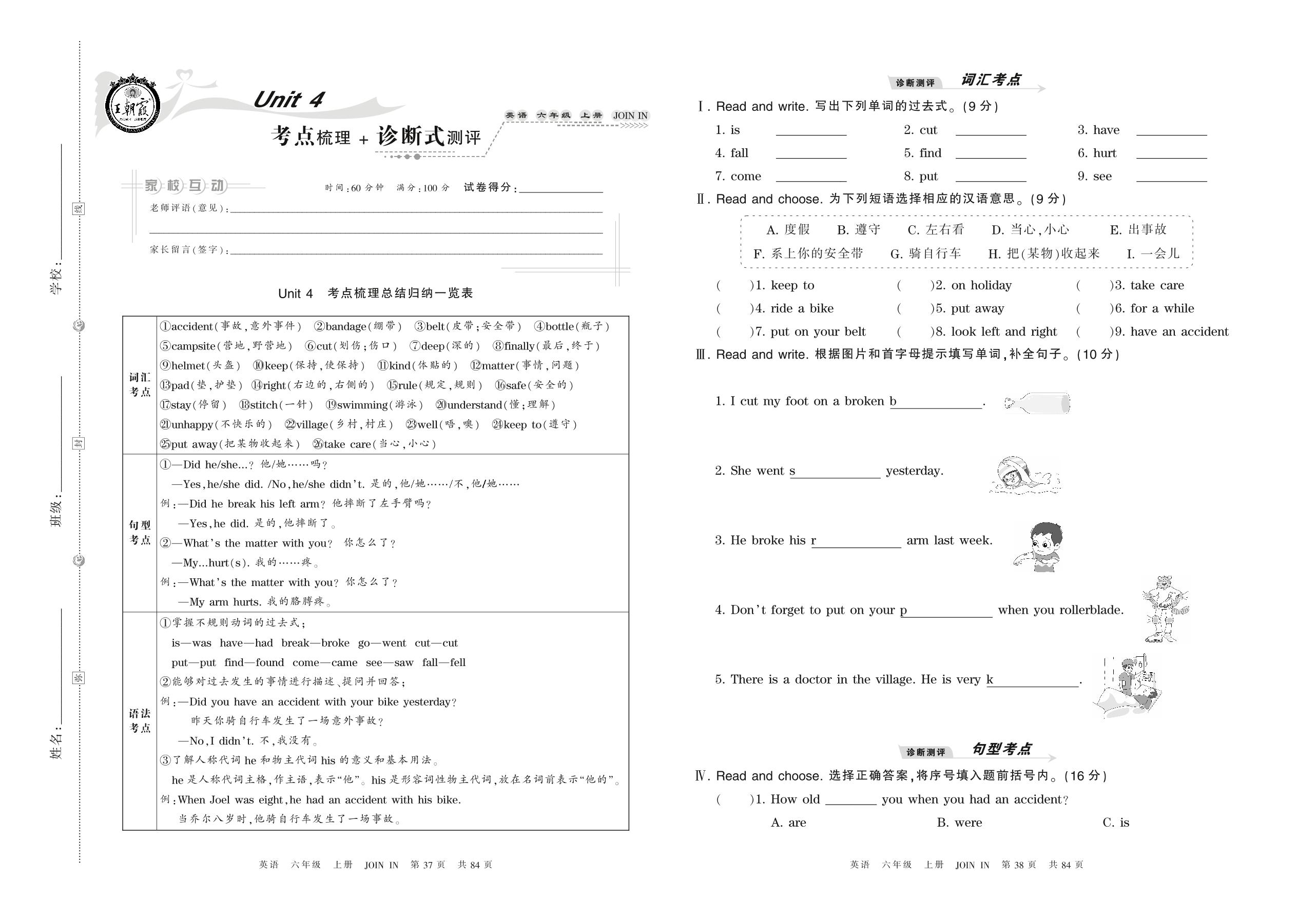 2021上册六年级英语剑桥版 Unit 4 考点梳理 + 诊断式测评