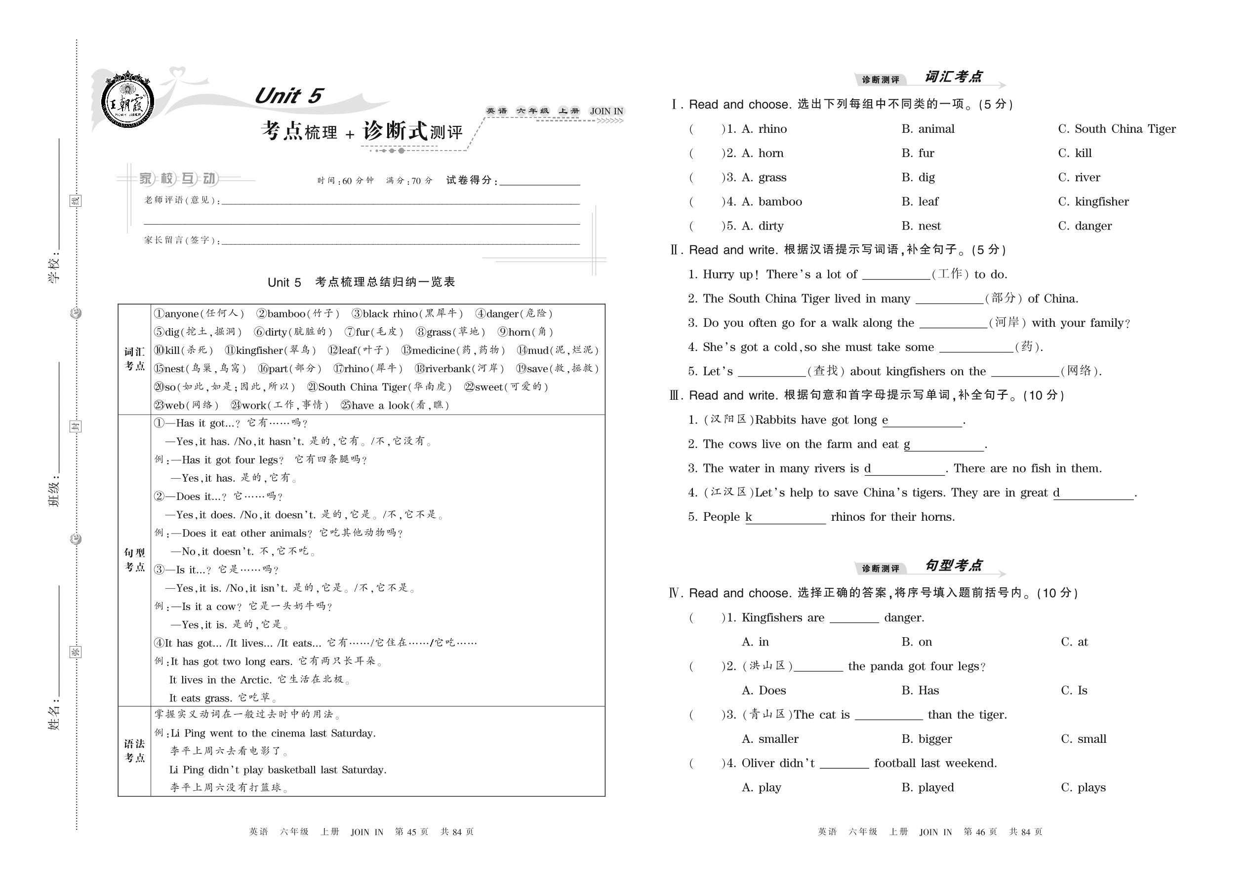 2021上册六年级英语剑桥版 Unit 5 考点梳理 + 诊断式测评