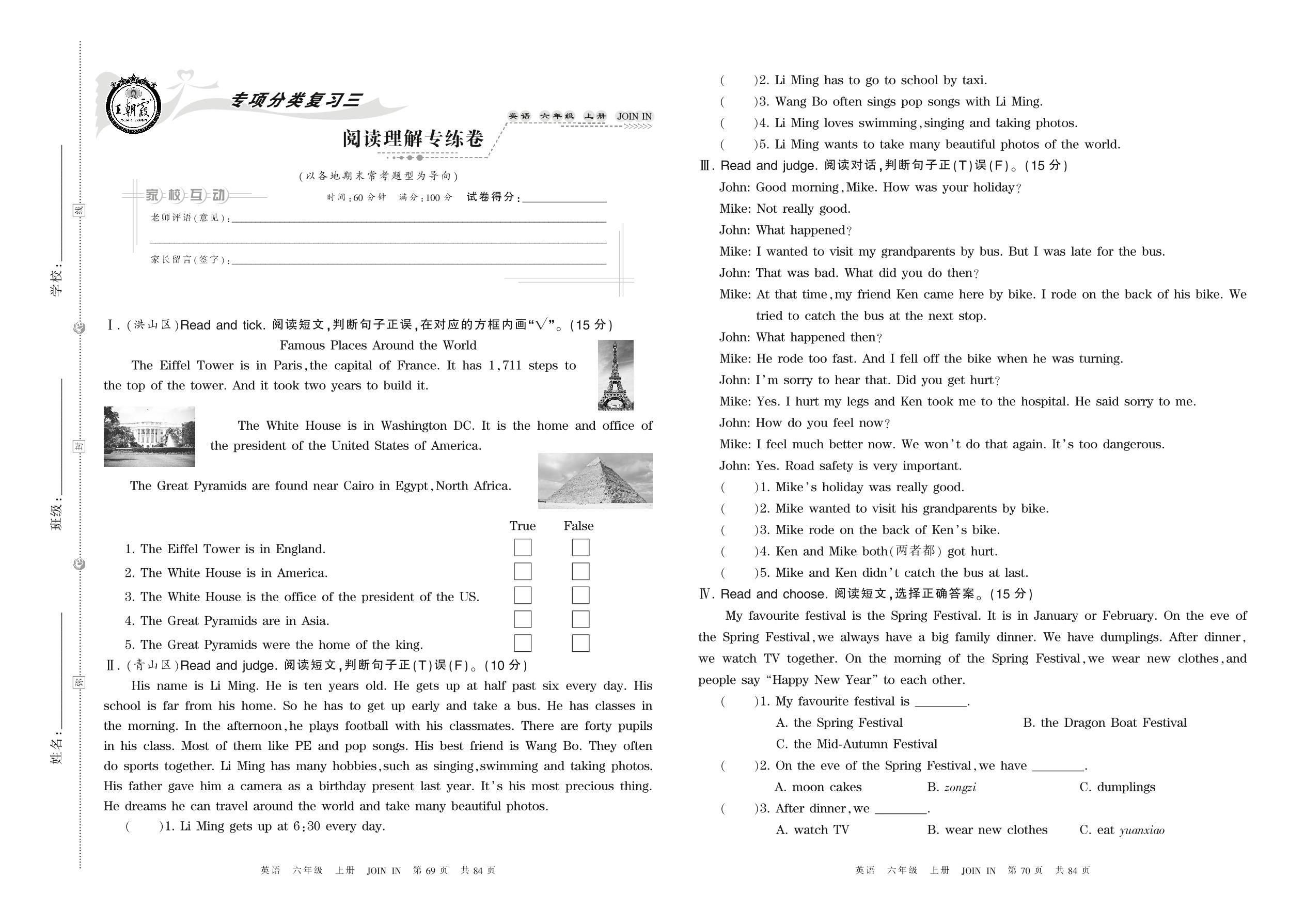 2021上册六年级英语剑桥版 阅读理解专练卷