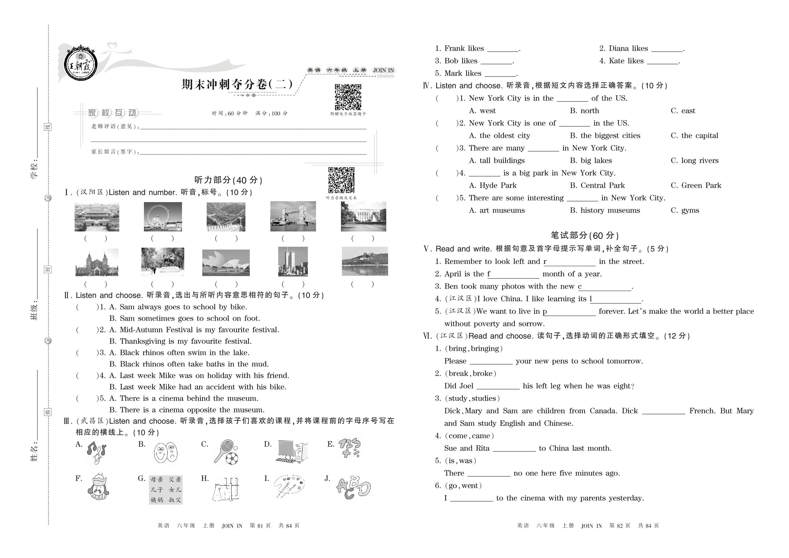 2021上册六年级英语剑桥版 期末冲刺夺分卷(二)