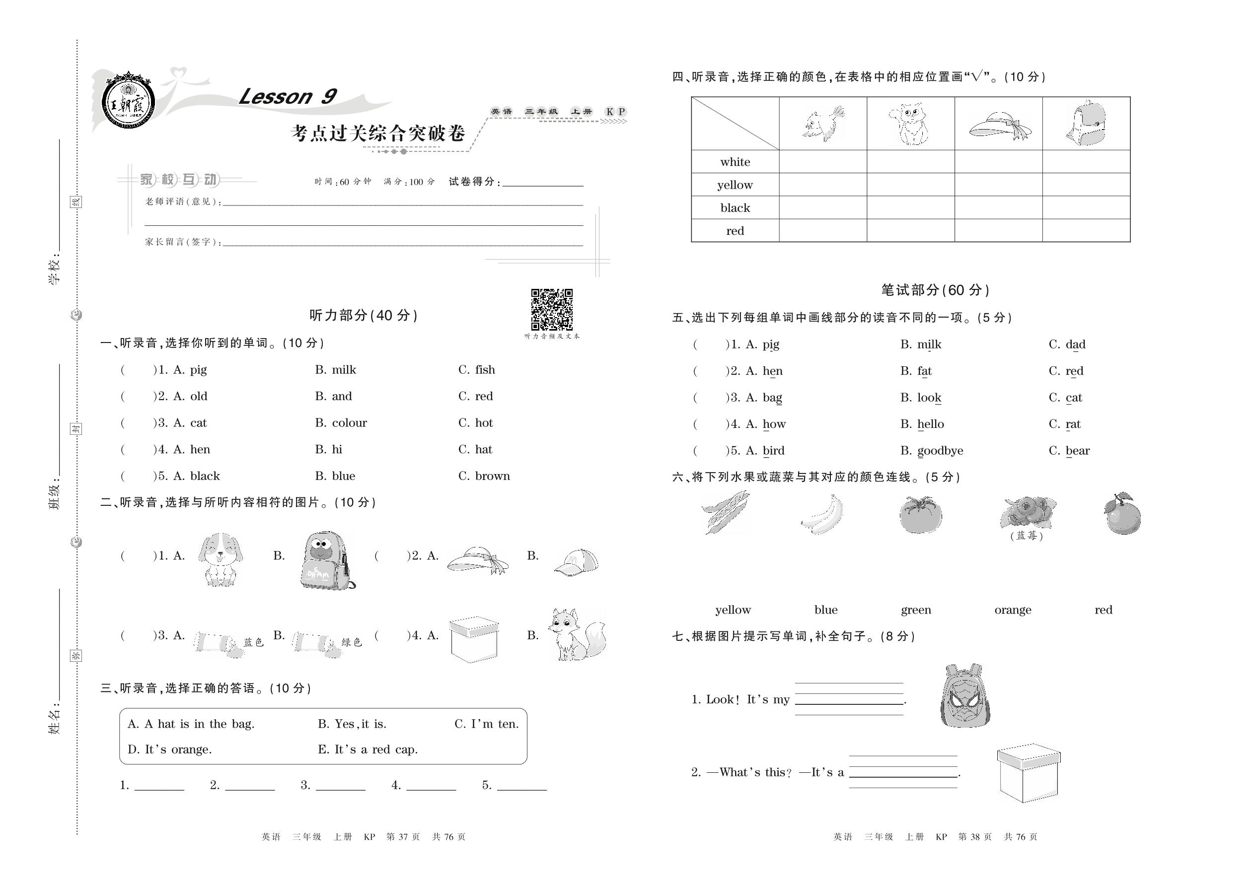 2021上册三年级英语科普版 Lesson 9 考点过关综合突破卷
