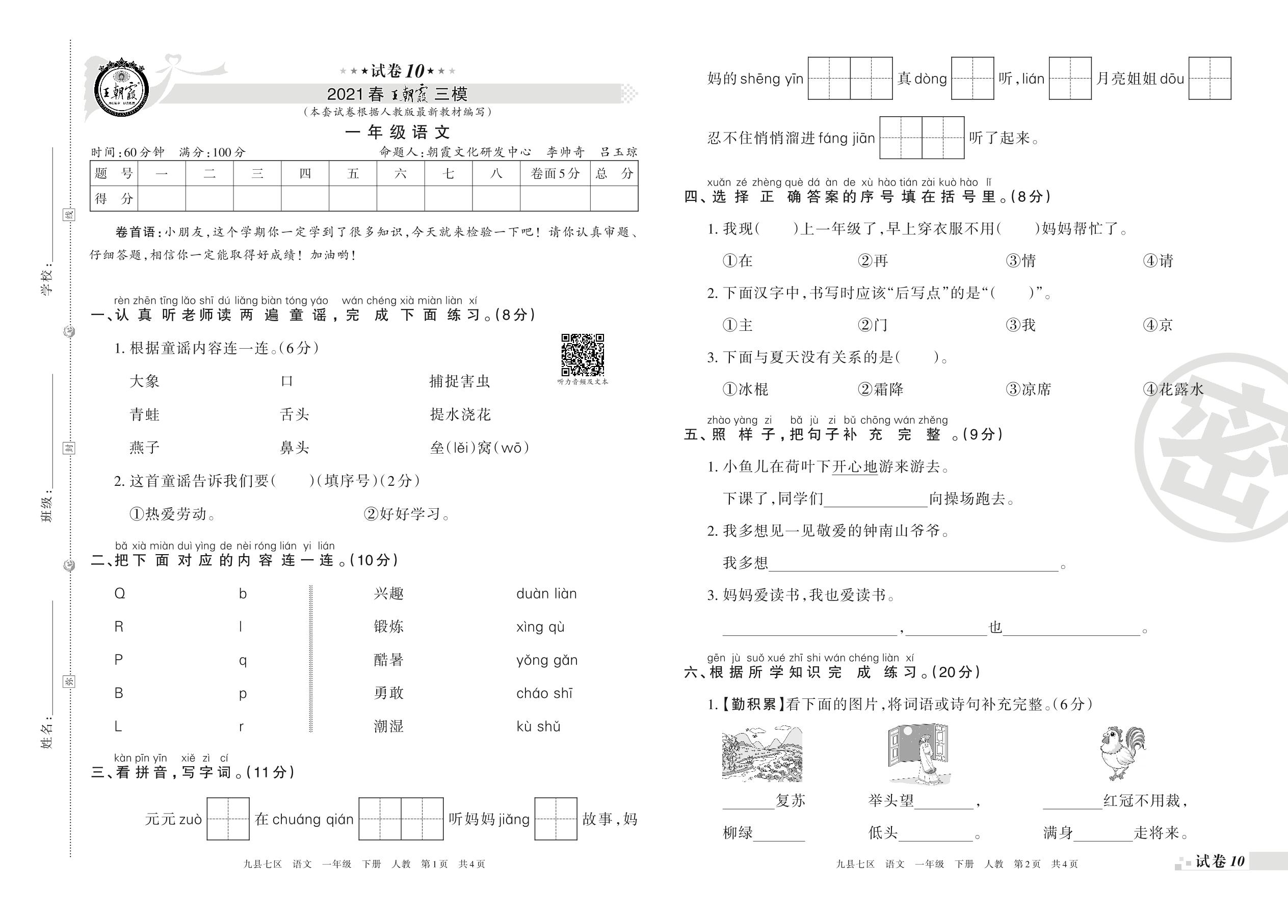 王朝霞期末模拟卷一年级下册语文(人教版)_R210731172957【10】