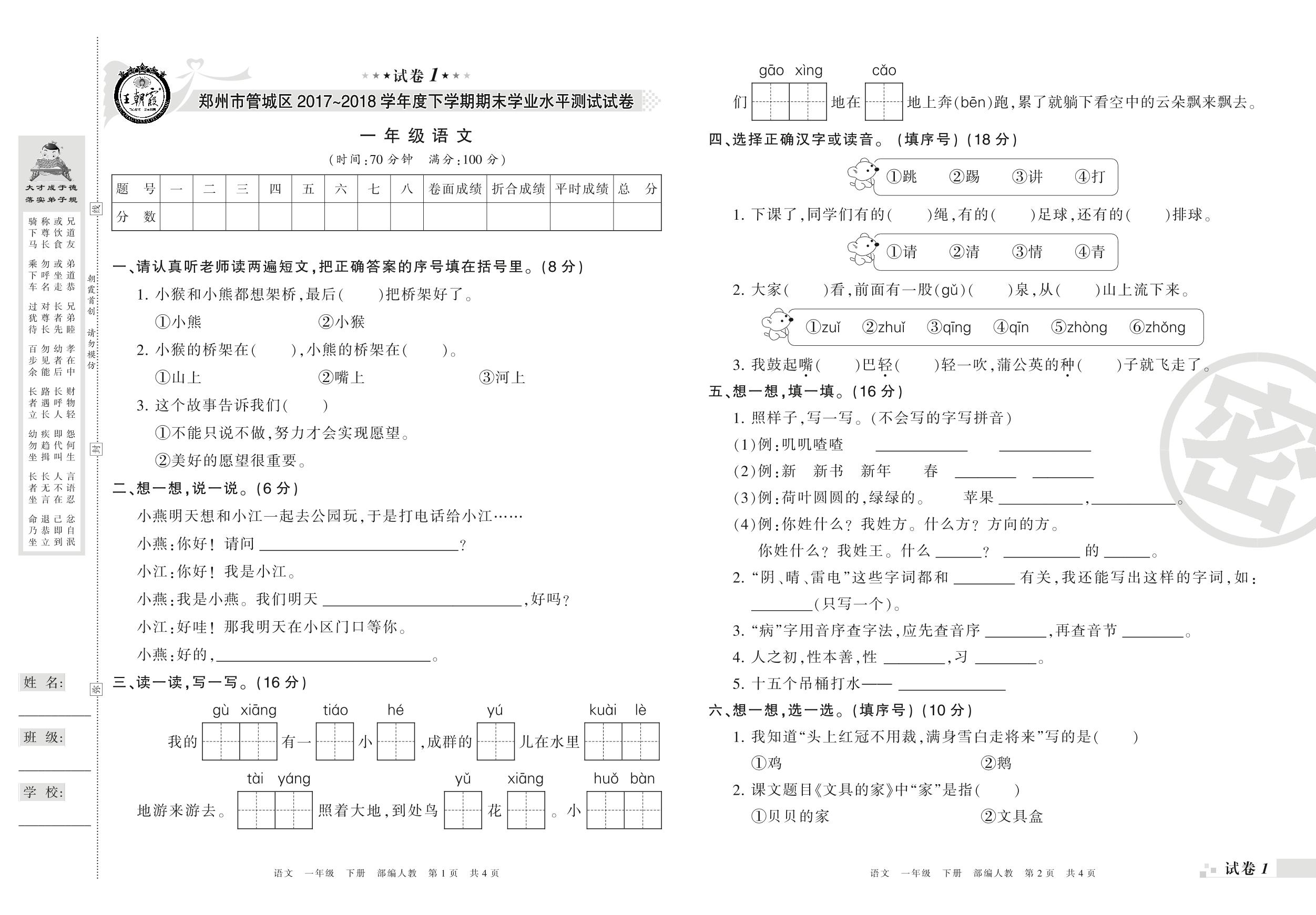 2017-2018学年第二学期郑州市管城区一年级语文试卷(人教版)_R210731181919【1】