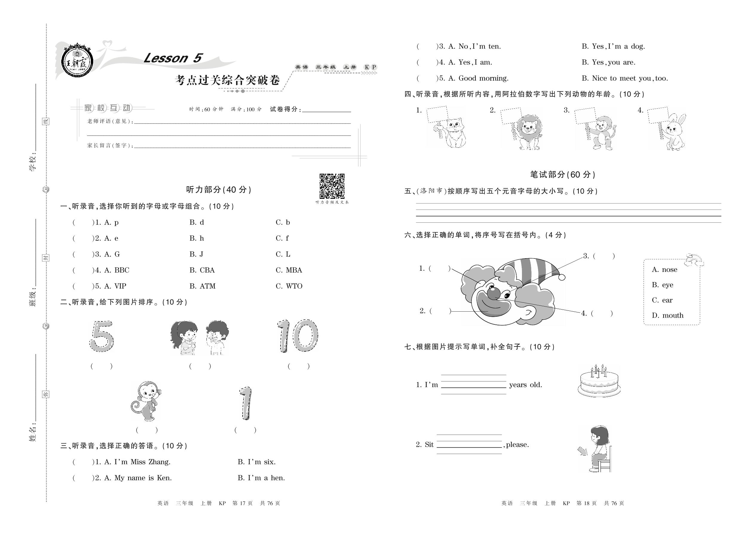 2021上册三年级英语科普版 Lesson 5 考点过关综合突破卷