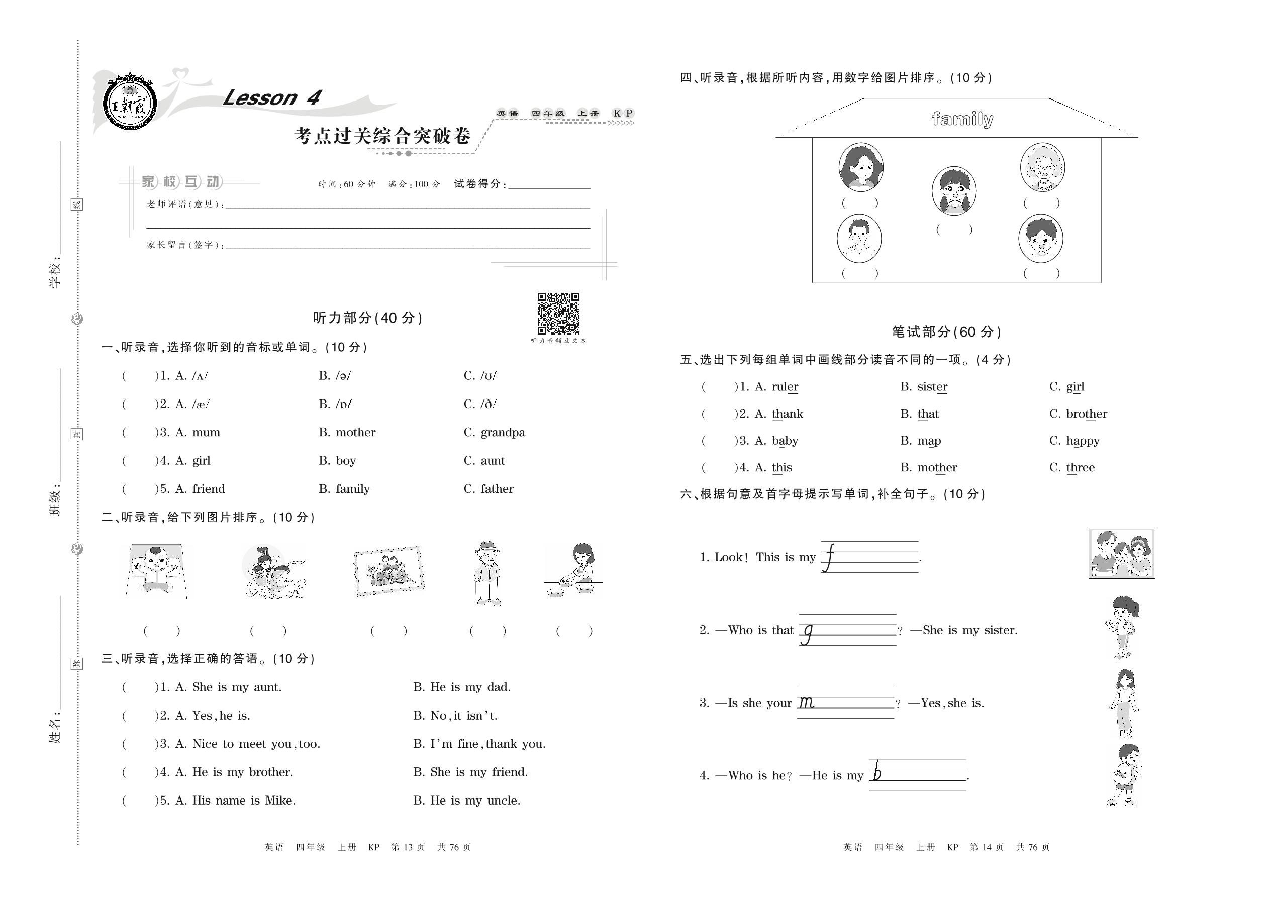 2021上册四年级英语科普版 Lesson 4 考点过关综合突破卷