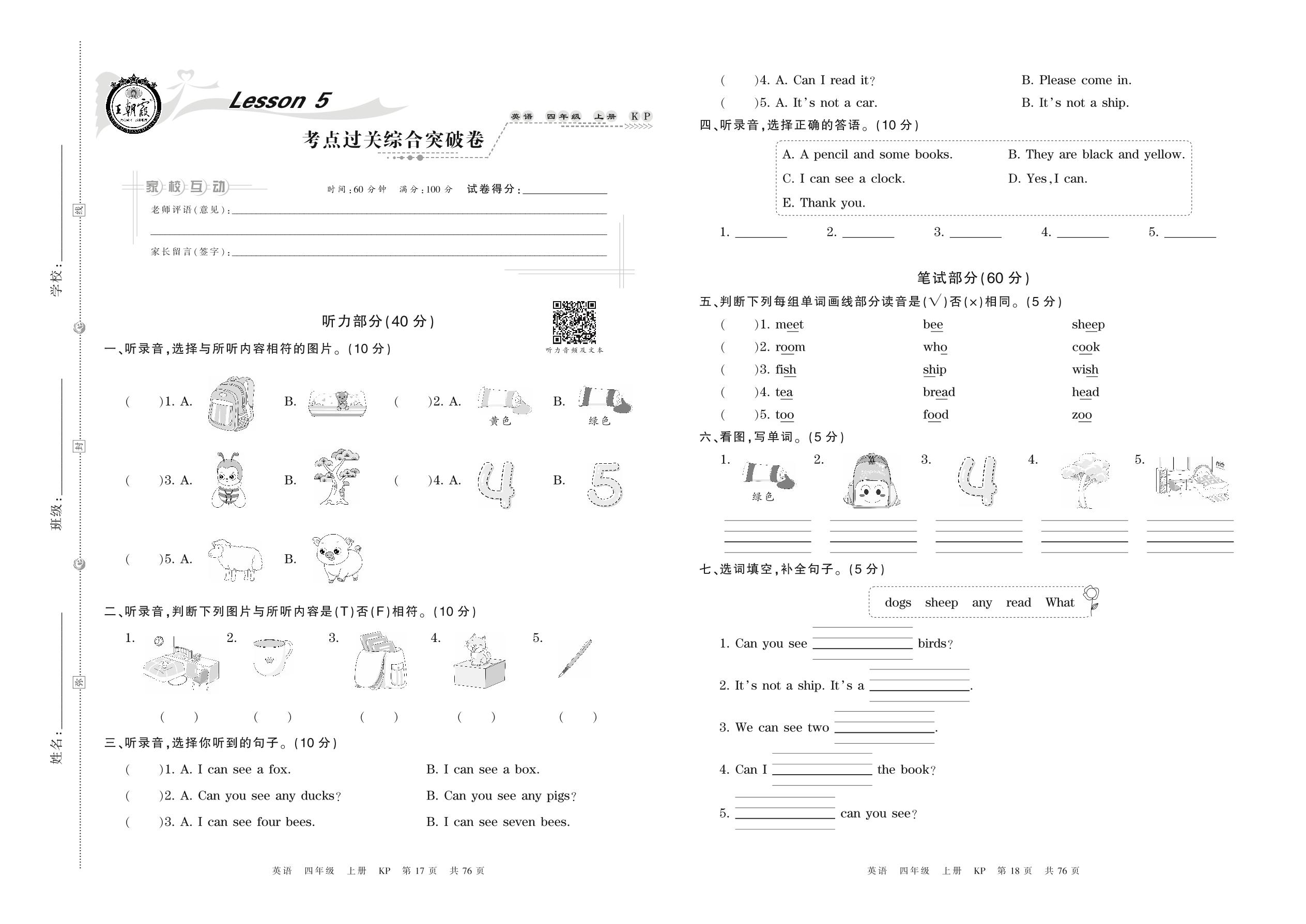 2021上册四年级英语科普版 Lesson 5 考点过关综合突破卷