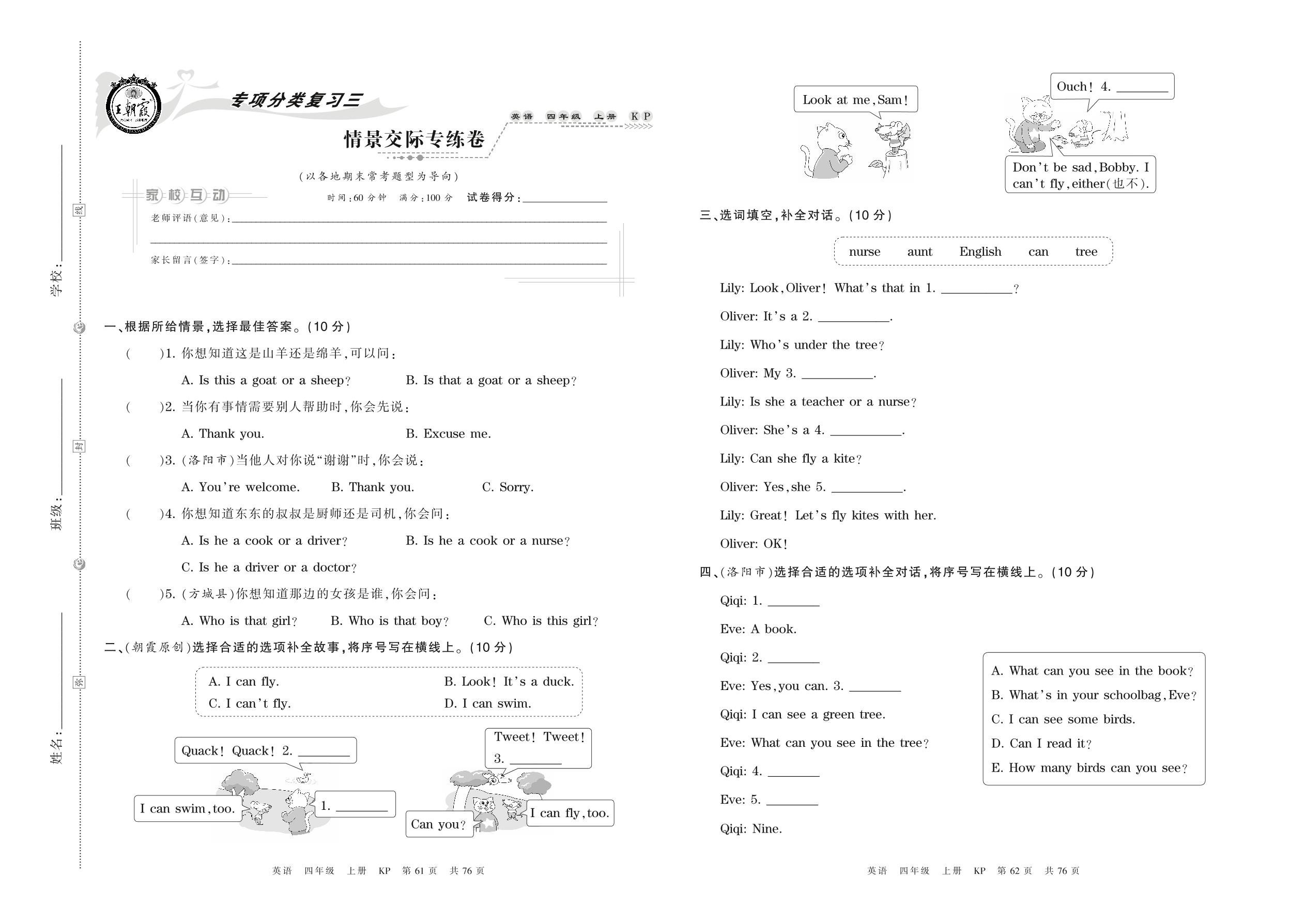 2021上册四年级英语科普版 情景交际专练卷