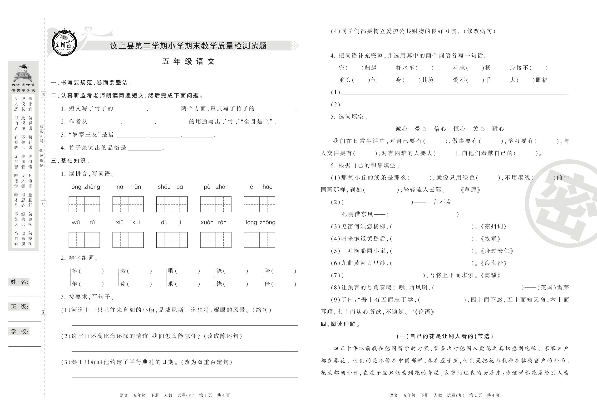 2015-2016学年第二学期济宁市汶上县五年级语文试卷(人教版)【9】