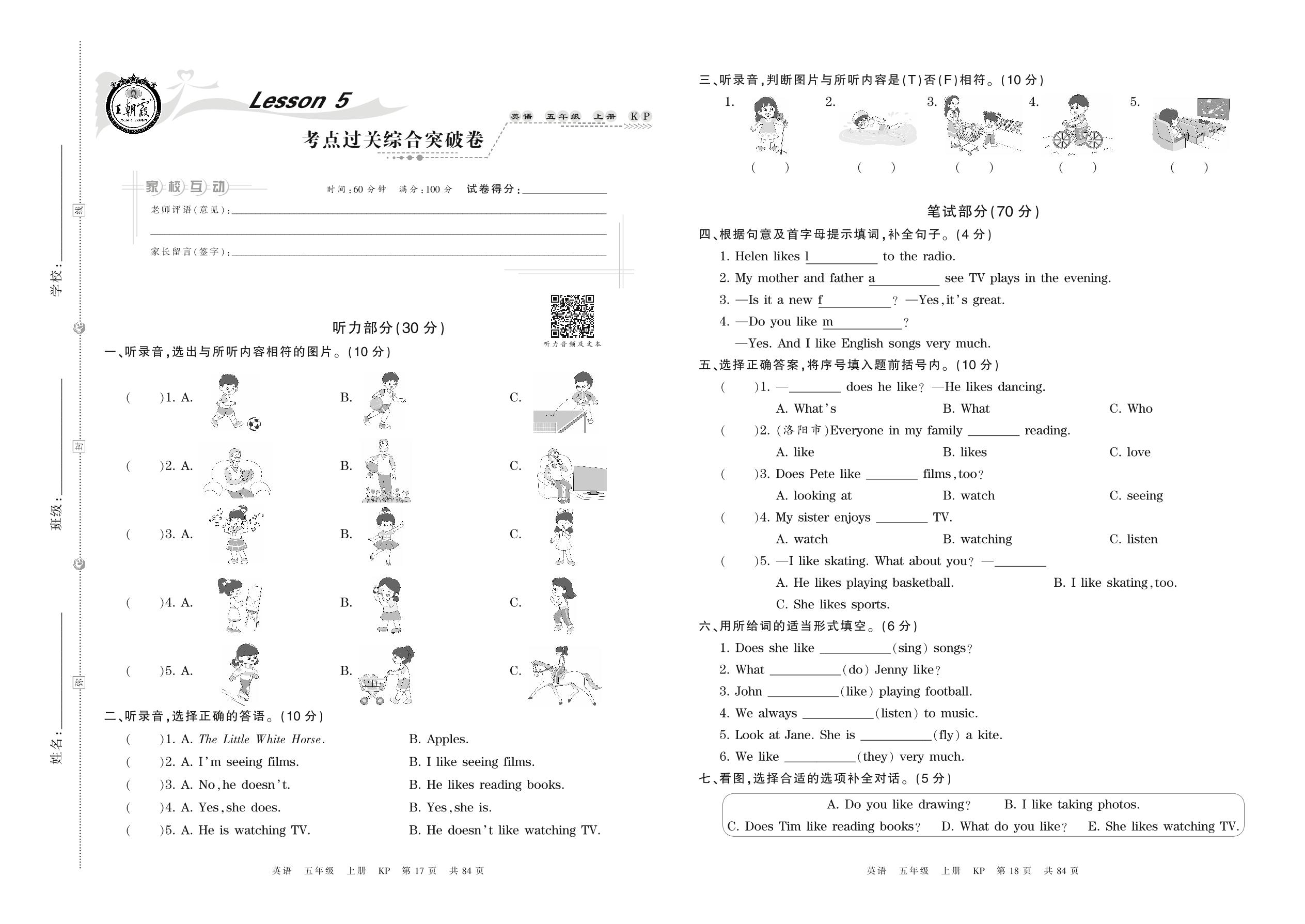 2021上册五年级英语科普版 Lesson 5 考点过关综合突破卷
