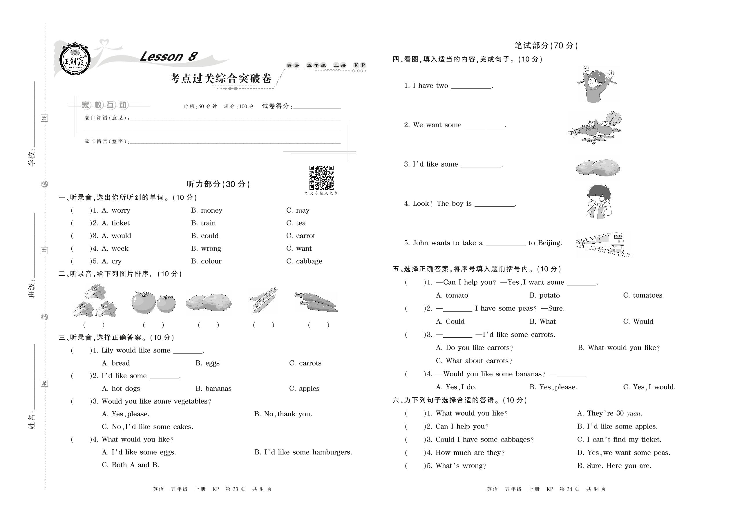 2021上册五年级英语科普版 Lesson 8 考点过关综合突破卷