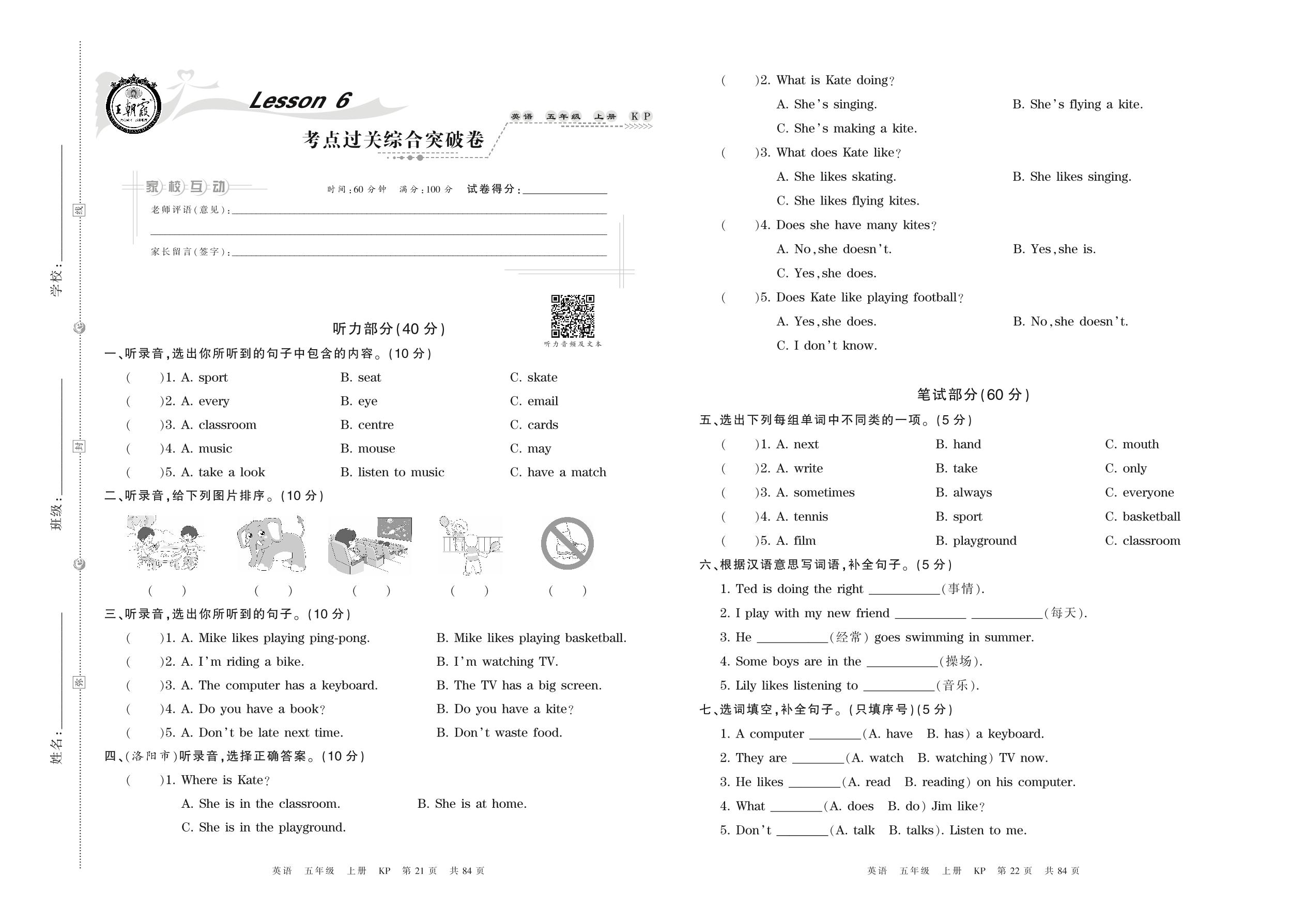 2021上册五年级英语科普版 Lesson 6 考点过关综合突破卷