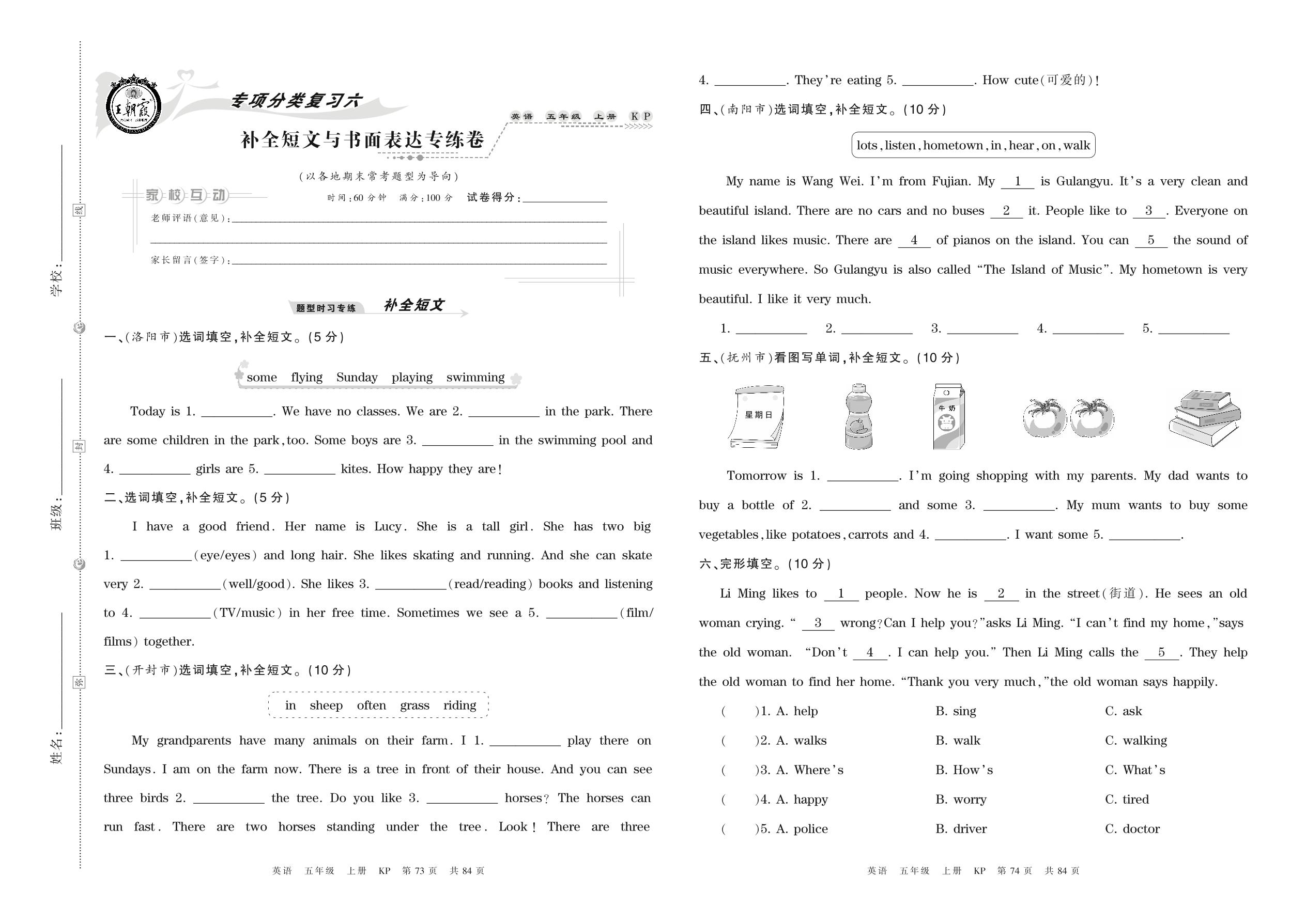 2021上册五年级英语科普版 补全短文与书面表达专练卷