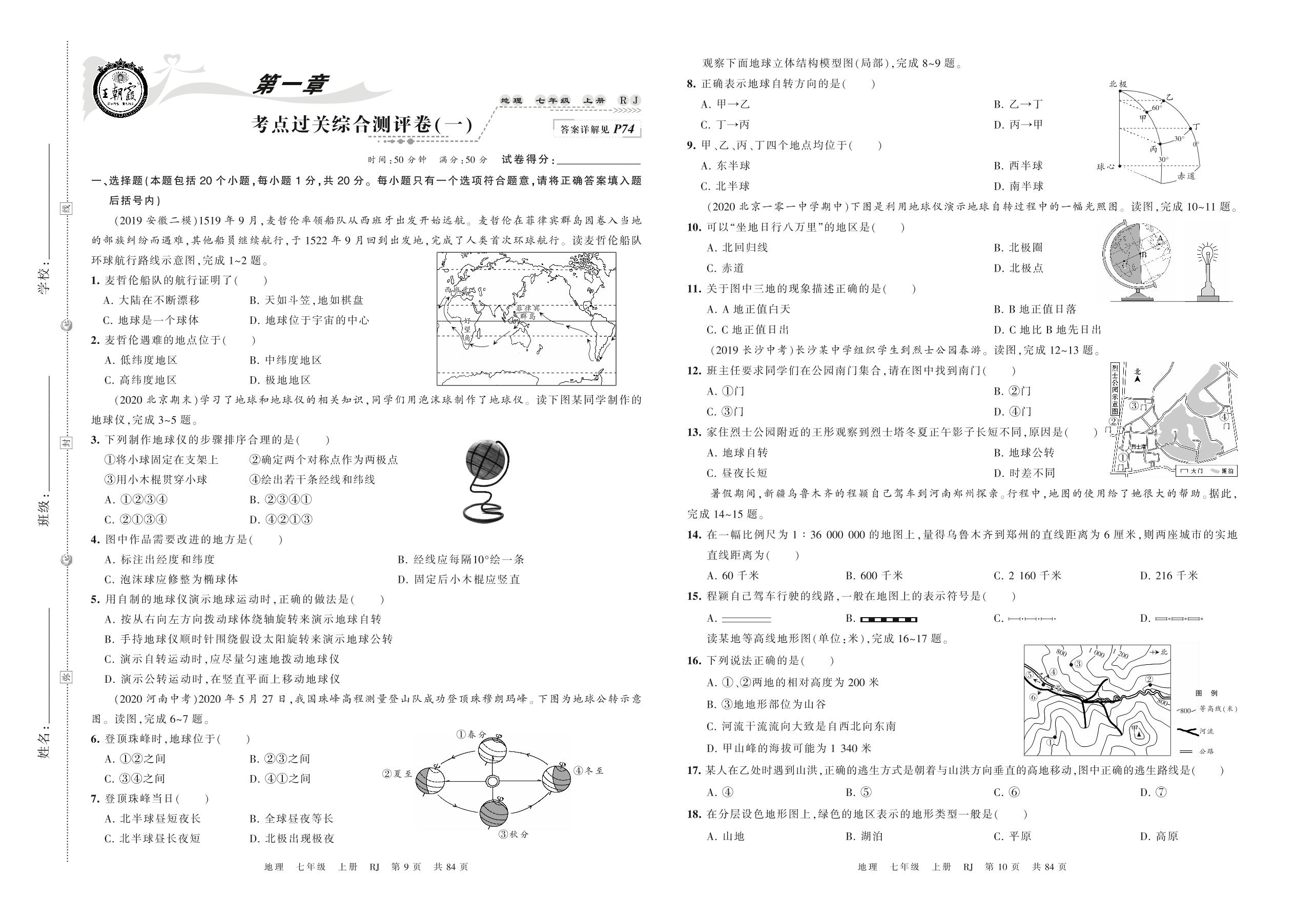 2021上册七年级地理人教版 第一章 考点过关综合测评卷(一)