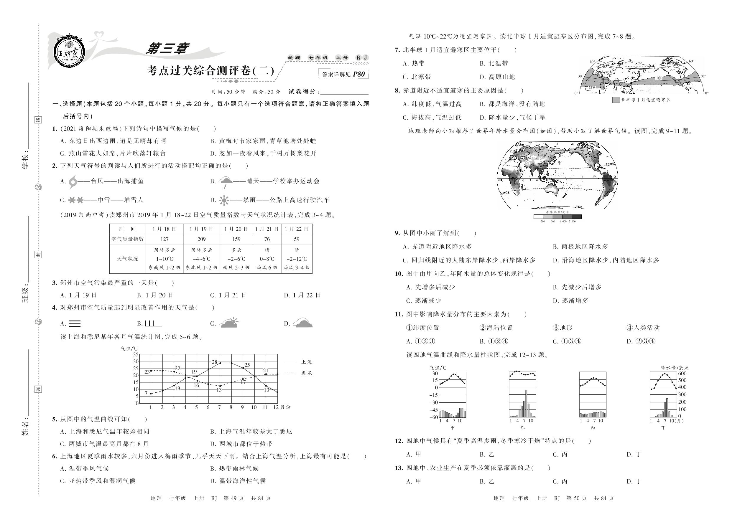 2021上册七年级地理人教版 第三章 考点过关综合测评卷(二)