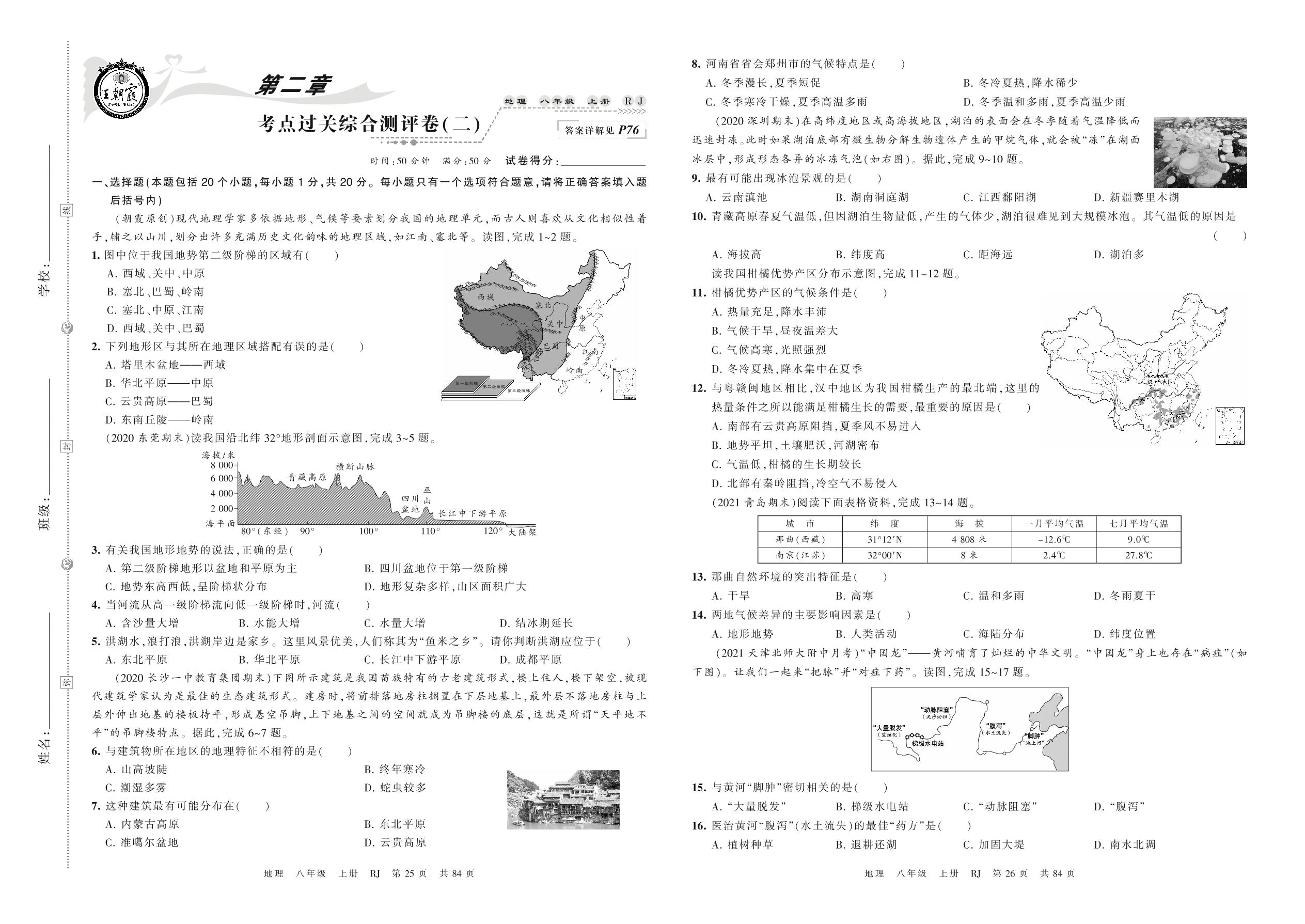 2021上册八年级地理人教版 第二章 考点过关综合测评卷(二)
